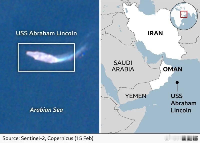 2月15日,哨兵-2卫星获取的卫星图像显示,美国海军林肯号航母(CVN-72)在与伊朗紧张局势升级之际,继续在阿曼海岸附近的北阿拉伯海海域开展行动。