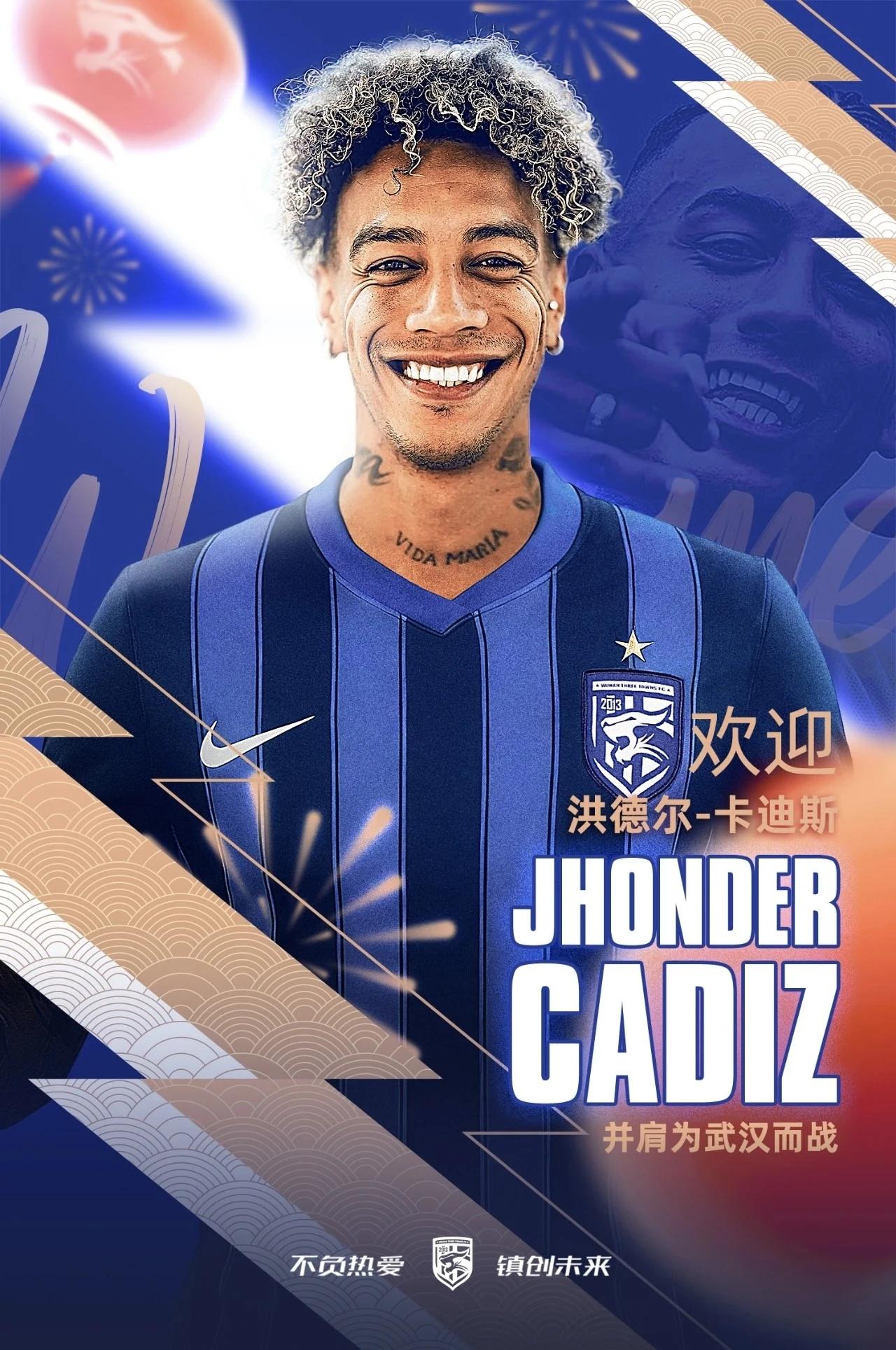 武汉三镇官宣:洪德尔·卡迪斯(Jhonder Cadiz)加盟 时间:2026年2月17日(大年初一) 球员:洪德尔·卡迪斯(Jhonder Cadiz,你说的“卡利斯”应为译名差异) 国籍:委内瑞拉 位置:中锋 出生:1995-07-29,190cm 转会:从墨西哥帕丘卡永久转会,合同2年+1年续约选项 身价:约280万欧元 球员履历(核心) 委内瑞拉国脚:18场2球 葡超法马利康:80场28球5助(2022–2024) 墨超莱昂:36场13球5助(2024–2025) 墨超帕丘卡:22场3球3助(2025.7–2026.2) 加盟意义 新帅莫拉(墨西哥)钦点,补齐锋线最后一块拼图 高中锋支点+抢点+终结,解决上赛季进攻乏力问题 五外援到位:卡迪斯、贝维斯、绍尔、菲尔米诺、亚姆卡姆中超