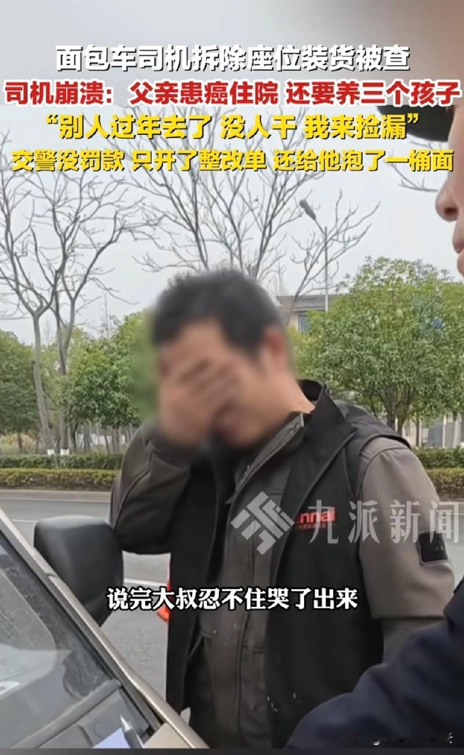 看哭了。湖南长沙,一男子把面包车座位拆除,用来装货运输。被交警查获的那一刻,他控制不住情绪有些崩溃,他说自己也是没办法,想趁着春节别人都不干的时候,多赚点钱。 原来男子的父亲得了癌症在医院,家里还有三个孩子要养,一家子的重担都压在他身上。他知道自己错了,但是对于这样的家庭,罚款对于他无疑是雪上加霜。 交警听了,默默的开了单子。男子接过单子的那一刻,有点不敢相信,这是一张整改单,没有罚款。 交警还把他领到屋里,给他泡了一包泡面,给他吃了。 这种有温度的执法,看的人心里暖暖的。给交警点赞!还有我相信这个司机,这个年过得一定是温暖的,希望他能度过难关,越来越好。