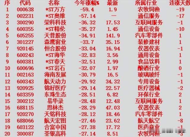 2026年以来,整个市场“跌幅最大”的名单 ST奥维:今年跌幅 -57.14%,连跌 17 天 ST万方:今年跌幅 -52.78%,连涨 4 天 ST精伦:今年跌幅 -44.64%,连跌 2 天 天普股份:今年跌幅 -38.03%,连涨 1 天 ST海华:今年跌幅 -37.92%,连跌 4 天 荣科科技:今年跌幅 -36.80%,连跌 3 天 恒合股份:今年跌幅 -35.93%,连涨 1 天 ST熊猫:今年跌幅 -35.65%,连跌 5 天 航天动力:今年跌幅 -35.57%,连跌 4 天 海南发展:今年跌幅 -32.97%,连涨 1 天