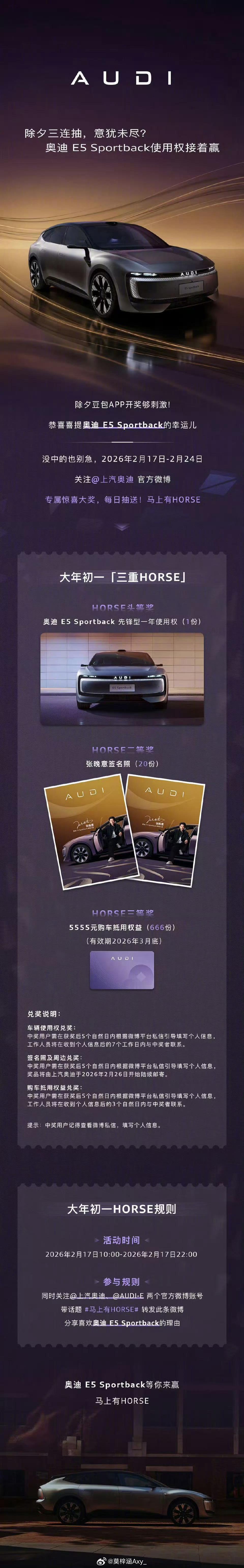年夜饭上抽中年度猎装轿跑引爆全网昨天春晚豆包为网友送出一辆奥迪E5Sportback,是谁抽到了新年头彩,马年第一波好运没赶上,还好后面还有返场,大年初一到初八,奥迪E5使用权、5555元购车礼金等好礼持续放送。作为首款上市当年就拿下CCOY中国年度车、微博年度车、总台风云轿车三项大奖的猎装轿跑,实力与含金量都拉满。它搭载豆包大模型与Momenta智驾,交互流畅、驾驶辅助靠谱,真正做到入门即满配。汽场全开新能源汽车