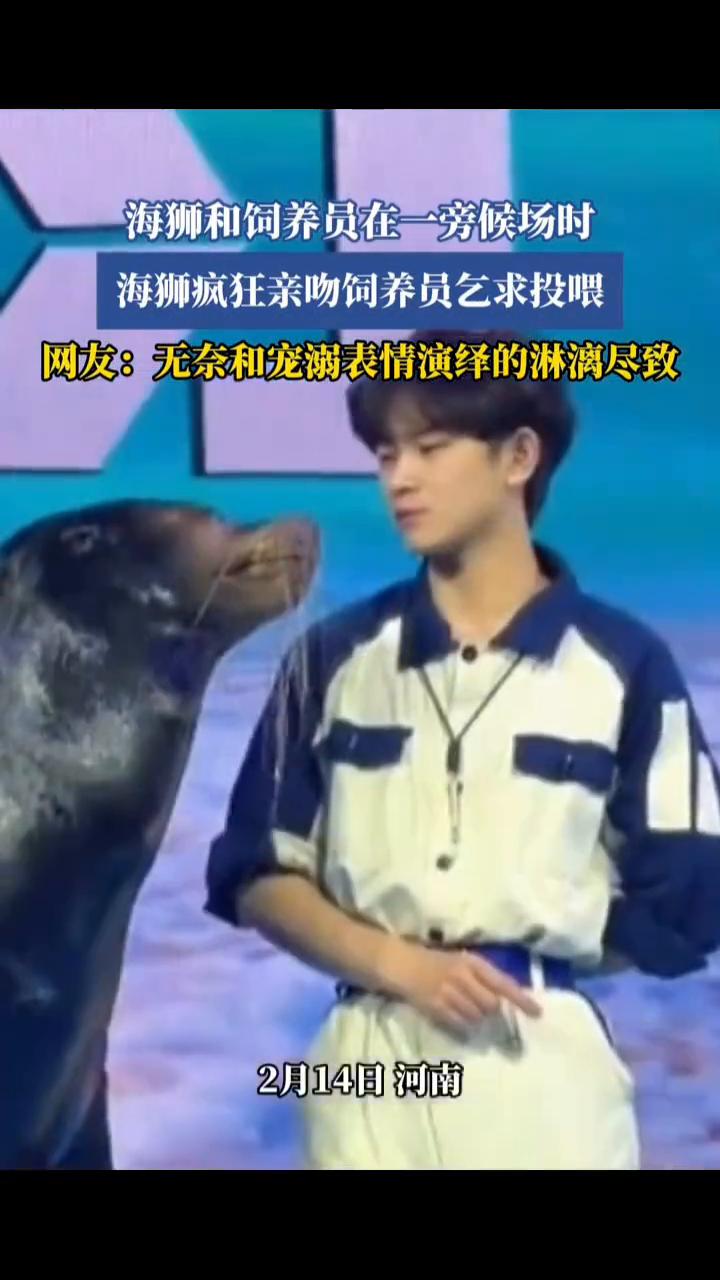 海狮和饲养员在一旁候场时,海狮疯狂亲吻饲养员乞求投喂。 网友:无奈和宠溺表情演绎的淋漓尽致。 2月14日河南,海狮和饲养员在一旁候场时,海狮疯狂亲吻饲养员乞求投喂。网友:无奈和宠溺表情演绎的淋漓尽致。