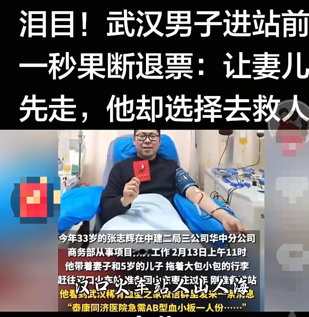 武汉火车站,一个男人拖着行李箱,准备核票上车时,突然收到一条信息,就转身跟老婆说:“我不走了,你们先回。”接下来他的做法让人很感动。 信息来源:个人网友分享 事情发生在2026年2月13日,上午差不多11点,地点是武汉汉口火车站检票口。 这个男人叫张志辉,33岁,左手牵着5岁的儿子,右手拽着行李箱,妻子在旁边。 原本是一家三口回山东枣庄过年的行程,票儿好不容易抢到,春运期间一票难求,他为这趟回家也熬了几个通宵。 但就在要进闸机的那一刻,他习惯性掏出手机,群里弹出一条紧急求助:泰康同济医院急需AB型Rh阴性血小板,两个治疗量,危重患者在等。 张志辉的心一下沉下去——他的血型就是AB型Rh阴性,民间叫“熊猫血”,在人群里很稀缺,能顶上别人的时候基本没有多余的选择。 他赶紧翻聊天记录,发现群里1月份刚组织过献血,很多人还在间隔期,能献血的就剩他一个符合条件的了。 想了想,他当下就对妻子说:“我得去献血,票退了,你们先走。” 5岁的儿子不懂事,站在一边拉着他衣角哭:“爸爸不要我们了吗?” 张志辉蹲下抱了抱孩子,掏出一颗橘子糖塞到他手里,声音有点哽:“乖,跟妈妈先回去,爸爸有点事,晚几天就到。” 妻子愣了一下,也没多说什么,默默帮他退票,还塞给他一瓶热牛奶叮嘱道:“献完血别瞎跑,找地方歇会,别冻着。” 他说了句“我马上到”,就朝血液中心跑去。 路上拦了车,11点30分左右到了武汉血液中心成分献血科,几乎是一路小跑进门的。 冬天风大,他甚至没来得及把羽绒服拉好拉链,脖子里冷风灌着也顾不上,一看就是为了赶那条命而来的急人。 这是他不是第一次被召唤。 早在2017年知道自己是稀有血型后,他就加入了“武汉稀有血型之家”这个群,只要群里有急需,他就会尽力赶去帮忙。 算上这次,已经是第15次献血,累计5200毫升全血的数据也在他之前的记录里——这些数字说明他不是只图一时冲动,而是长期在参与紧急救助。 到血站后,体检、化验、分离采血等一系列流程很快完成。 他躺上献血床,看着血液从管子里流出,脑子里闪过的是儿子委屈的小脸和病床上那个素不相识的患者。 护士们忙碌又专业,他嘴里还开着玩笑:“我这血,可是救了不少人呢。” 可心里那份疲惫和错过团圆的愧疚,只有他自己知道。 献完血后,他第一时间在购票APP上疯狂刷新抢票。 工作人员担心他抢不到票,他反而轻描淡写:“没关系,晚几天回家没事,只要人没事,比什么都强。” 后来他运气不错,抢到了一张站票,晃晃悠悠地回了山东老家,补上了和家人的团聚。 这事被人拍下来传到网上后,很多人看了都哭了,称他“熊猫侠”,说他是春运里最暖的逆行者。 张志辉自己却很低调,觉得自己不过是做了该做的事。 确实,没有谁天生就是大英雄,更多时候是普通人在关键时刻,做了一个看着简单但不容易的选择。 他退掉的是一张回家的车票,可能错过了和家人的团聚,但争取到的,是给病人多一点活下去的希望。 在大家赶着回家的春运里,有人把自己的团圆时间往后推一推,把救命的机会让给了另一个家庭。 为他的做法点赞,而她的老婆也很善良,祝福他们未来日子越来越好!