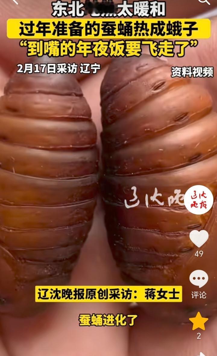 “到嘴的年夜饭要飞走了”!辽宁,女子发视频称,原本准备的年夜菜,结果因为东北屋里地暖太热,到嘴的年夜饭要飞走了。原来女子家里买了蚕蛹,结果因为地暖太热,蚕蛹直接进化了,变成蛾子了。 蚕蛹的味道主要以咸鲜为主,烹饪后香脆可口,很受吃货们的喜爱。 因为地暖太热,到嘴的美味就这样飞走了,实属可惜,不过这也说明女子和家人没有这个口福。 蚕蛹适合的保存温度,冷藏保存一般需要3到5度,冷冻保存需要-18度以下,东北地暖温度一般都是十几二十多度了,所以蚕蛹是很容易进化成蛾子的。