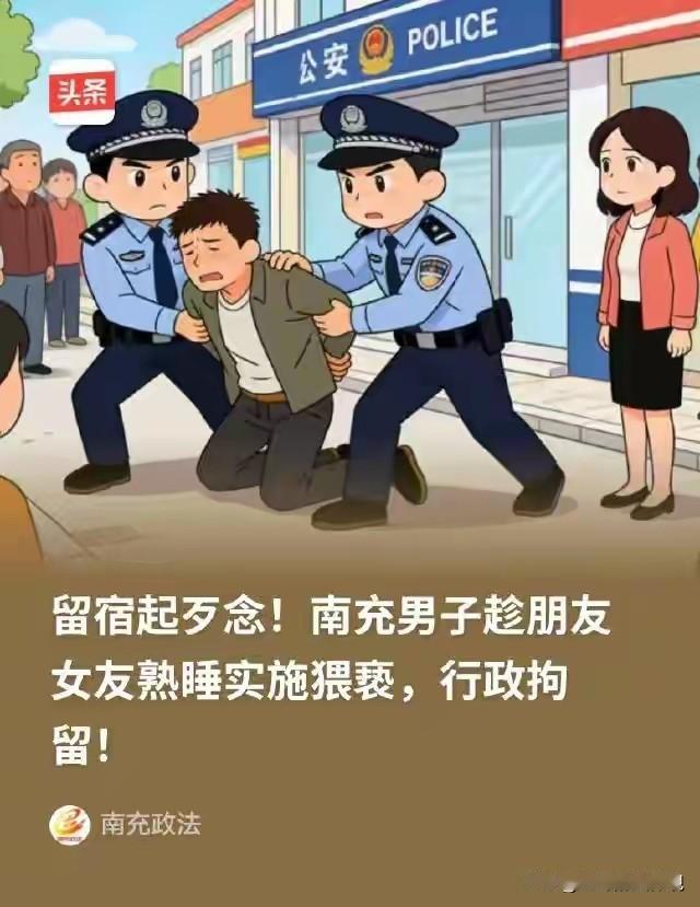 这是人干的事吗?四川南充,一男子酒后借住朋友家,朋友有事外出,家里只留下熟睡的女友,和借住的男子两人。不料,男子竟然起了色心,偷偷溜进朋友房间,对还在熟睡中的朋友女友,实施了猥亵,女子惊醒,丝毫没犹豫,立马去报了案! 安某和好朋友张某相识多年,平时两人关系很好。 有事时,两人也相互帮忙,处的就像亲兄弟,安某 从未想过对方会有不轨之心。 你无耻!李某猛地从睡梦中惊醒,刚才本以为那触感是在梦中。 可此时,她睁开眼,一只手正在她的身上游走。 而那个人,正是昨晚一起吃饭喝酒的朋友张某。 这事说起来,还真是引狼入室! 那天,安某和女朋友李某,带着好哥们张某,三人在外面吃宵夜。 他们边吃边聊,谈着往事,憧憬着未来,说着身边的趣闻。 等三人酒足饭饱后,已经将近凌晨6点。 安某看时间实在太晚,心想着张某离家太远,住酒店又不方便。 出于好友的情谊,便热情地邀请张某:“兄弟,干脆别折腾了,去我家凑合睡几个小时,明早再走。” 张某当时连声答应,2月4日凌晨6点左右,三人一块来到了安某家。 因为家里地方小,安某就给张某安排了在沙发上休息。 自己则带着女友李某回了卧室补觉。 谁也没想到,这一份仗义的收留,竟然给后来的荒唐事埋下了引信。 当天上午九9点左右,安某突然接到一个电话,有急事需要临时出门一趟。 看着女朋友李某还在屋里睡得沉,想着好哥们张某也在家,应该没啥大事。 他迅速起床,临走时,给张某说,自己有事出去一会儿,让他先休息。 他不舍得打扰女朋友,就轻手轻脚地关上房门走了。 可就在安某前脚刚走,客厅里的张某动了歪心思。 或许酒精还没散尽,也可能是心里的底线,在那一刻彻底崩塌! 他听着卧室那边没有动静,又确定安某已经走远。 于是,他鬼使神差地推开了安某卧室的房门。 卧室里,李某正处于熟睡状态,对即将到来的危险毫无察觉。 张某看着毫无防备的年轻女子,胆子越发大了起来。 他彻底忘了兄弟情谊,和“朋友妻”不可欺的底线。 他不仅没有退出去,反而凑上前去,对熟睡的李某动手动脚。 李某在睡梦中,感觉到有人用手在自己身上抚摸,迷迷糊糊中,她以为是男友。 可第六感觉,她就是觉得不对劲,猛的睁眼一看,眼前的景象让她出了一身的冷汗。 此时,躺在她身旁的竟然是张某! 本该在外面休息的男朋友兄弟,竟然在对自己动手动脚。 李某虽受到惊吓,但她反应极快,立刻翻身坐起,指着张某的鼻子严厉斥责他无耻。 张某显然没料到,李某会醒得这么快,更没料到对方态度如此强硬,顿时愣在原地,场面极度尴尬。 李某没有任何犹豫,她知道这种事绝不能私了。 更不能,因为对方是男朋友的朋友,就含糊过去。 她一边稳住情绪,一边第一时间冲出了家门,直奔派出所报案。 接到报案后,民警在了解基本情况后推断,张某可能还没来得及逃离现场。 民警很快就赶到安某家里,果然,当民警推门而入时,张某正坐在安某家客厅的沙发上。 或许是心存侥幸,或许是还没想好怎么面对回来的朋友。 面对民警,张某之前的色胆全没了,仅存的那点酒意也被吓醒了。 在派出所里,面对铁证和李某的指证,他低下了头。 对自己趁人之危、猥亵朋友女友的违法事实,供认不讳。 张某因为猥亵他人,被警方依法行政拘留。 原本是一场宵夜过后的借宿,却因为张某的一时起念,而触犯了法律。 安某听女友说了此事,半天不敢相信,自己的好朋友会做出这种背叛自己、伤害女友的事。 这种背叛,比任何伤害都让他心痛。 安某觉得对不起女友,希望警方还女友一个公道。 张某也因为酒后做出不耻之事,彻底毁掉了多年的朋友情谊。 这事儿在当地传开后,大家议论纷纷。 有人感慨,这真是引狼入室,这次记住了,再好的朋友都不要留宿,因为人心难测! 也有人提醒,不管关系多好,基本的社交边界和安全意识必须要有。 李某的果断报警,很值得点赞,面对这种侵害,退让只会让坏人变本加厉,只有法律才是最好的保护伞。 不管是多好的朋友,做人,总得守住最起码的良知和底线。 依据《治安管理处罚法》第44条规定:猥亵他人的,或者在公共场所故意裸露身体,情节恶劣的,处5日以上10日以下拘留; 猥亵智力残疾人、精神病人、不满14周岁的人或者有其他严重情节的,处10日以上15日以下拘留。 条款明确了猥亵他人,属于违法行为,会受到治安管理处罚。 本案中,张某趁朋友外出,对其熟睡中的女友实施猥亵。 其行为违背了他人意愿,侵犯了他人的人身权利和尊严。 本案未提及,张某有暴力等强制手段,且未造成严重后果,属于一般猥亵行为,符合上述条款中“猥亵他人”的情形。 所以,张某被警方依法行政拘留,体现了法律对侵犯他人人身权利行为的制裁。 对此你怎么看? 天南地北大拜年 关注@赵哥的法律观欢迎评论区发表您的看法。