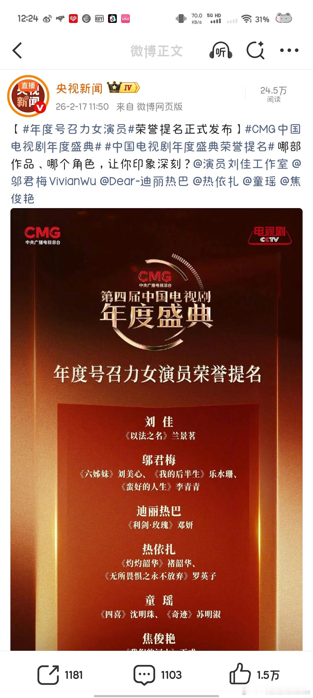 刘佳、邬君梅 、迪丽热巴、热依扎、童瑶和焦俊艳获得第四届中国电视剧年度盛典年度号召力女演员荣誉提名。