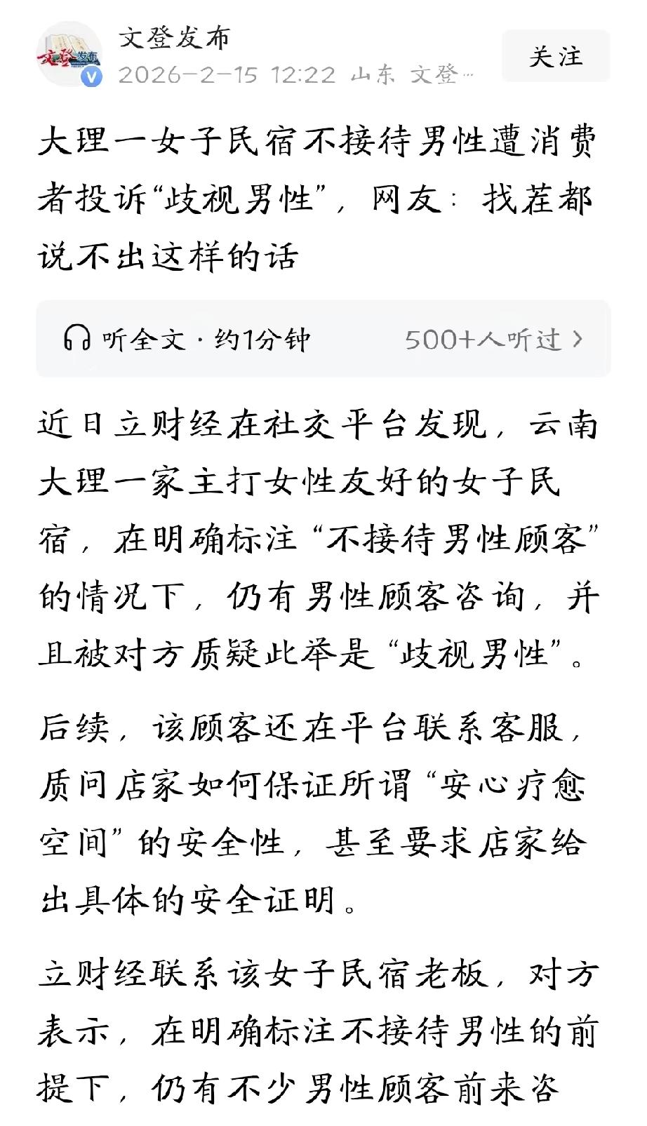 故意找茬?云南大理,老板开了家女子民宿,专门为女性朋友提供安心的疗愈空间,还明确标注“不接待男性顾客”。谁知,这一规定让有些男顾客不舒服,质疑老板是歧视男性 ,甚至将老板投诉,这让老板倍感委屈。网友:女厕所也不让男人进,你咋不投诉? 有一家特别的女子民宿,它主打女性友好,从开业起就明确标注“不接待男性顾客”。 民宿老板这么做,初心是想给来云南游玩的女生们提供一个安心疗愈的空间,让她们能在这儿尽情放松,享受独属于自己的美好时光,不用有任何安全方面的顾虑。 可没想到,这一经营选择却引来了麻烦。 有位男性顾客在网上看到了这家民宿的信息,明明看到了“不接待男性顾客”的标注,他还是抱着试试看的心态进行了咨询。 咨询过程中,他心里越想越觉得不舒服,直接质疑店家这是“歧视男性”。 在他看来,大家都是消费者,凭什么只因为性别就被拒绝入住呢? 这还没完,这位男性顾客随后又在平台联系了客服。他质问店家:你们说能提供安心疗愈空间,可怎么保证它的安全性呢?得给我拿出具体的安全证明来。 客服面对这突如其来的质问,耐心解释民宿的经营理念和安全保障措施,但这位顾客似乎并不买账。 随后,记者联系上了这家女子民宿的老板。 老板无奈地表示,他们在各个平台都明确标注了不接待男性,可还是有不少男性顾客前来咨询,像这次这样的情况可不是个例。 老板心里也觉得委屈,自己明明是为了给女性创造一个更好的环境,怎么就被误解成歧视男性了呢? 这件事在网络上引起了不小的讨论。大部分人都觉得应该尊重店家的经营选择,人家开民宿就是想按照自己的想法来,给女生一个专属空间,那些不懂换位思考的行为真的大可不必。 就像女厕所也不接待男性,也没见有人去投诉,大家不都觉得很正常嘛,要是真有个全男民宿,大家肯定也会尊重的,没必要上纲上线。 《民法典》第五条规定:民事主体从事民事活动,应当遵循自愿原则,按照自己的意思设立、变更、终止民事法律关系。 民宿经营者在平台显著公示仅接待女性,属于基于安全与私密需求作出的合理经营定位,并非基于性别贬低或歧视男性,也未损害社会公共利益与公序良俗。 该行为受民法典自愿原则与经营自主权保护,不构成法律意义上的性别歧视。 民宿面向女性群体提供专属服务,与女卫生间、女性专属车厢等合理区分场景性质一致,目的是保障特定群体安全与隐私。 男性顾客在明知规则前提下强行要求入住并投诉,缺乏法律依据。 民宿老板始终坚持自己的初心,她觉得只要能给女性提供一个安全、舒适的住宿环境,哪怕遇到一些质疑和误解也是值得的。