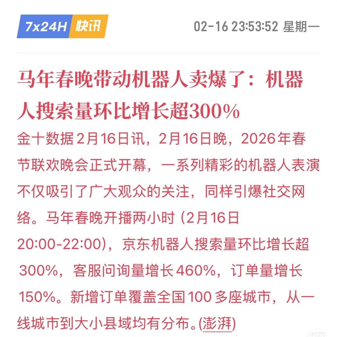 春晚这个机器人的带动效应还是蛮强的。马年春晚昨天晚上最新的数据 刚开播两小时,京东机器人搜索量直接翻了3倍,咨询量暴增四五倍! 最抢眼的是那台62万的银河通用机器人G1。有人说“被秒抢”还真没夸张,确实卖了两台,但能卖出两台已经够说明问题了。毕竟不是普通人消费得起的! 同时也说明现在愿意为高科技买单的人确实多了。 这波流量,真金白银。