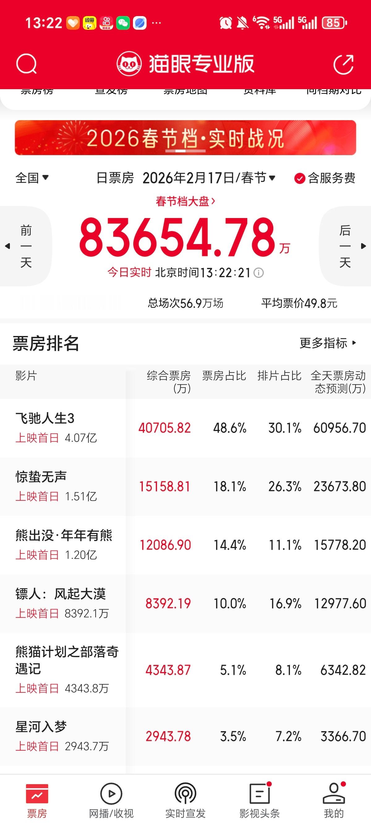 春节电影档战况初一下午1点半 星河入梦第一个出局,实时预测已经从5000降到3300,最后能有2亿么其余五部都比初始预测上升,飞驰涨到6亿,惊蛰无声2.36亿第二个出局的不知道是熊猫计划还是镖人