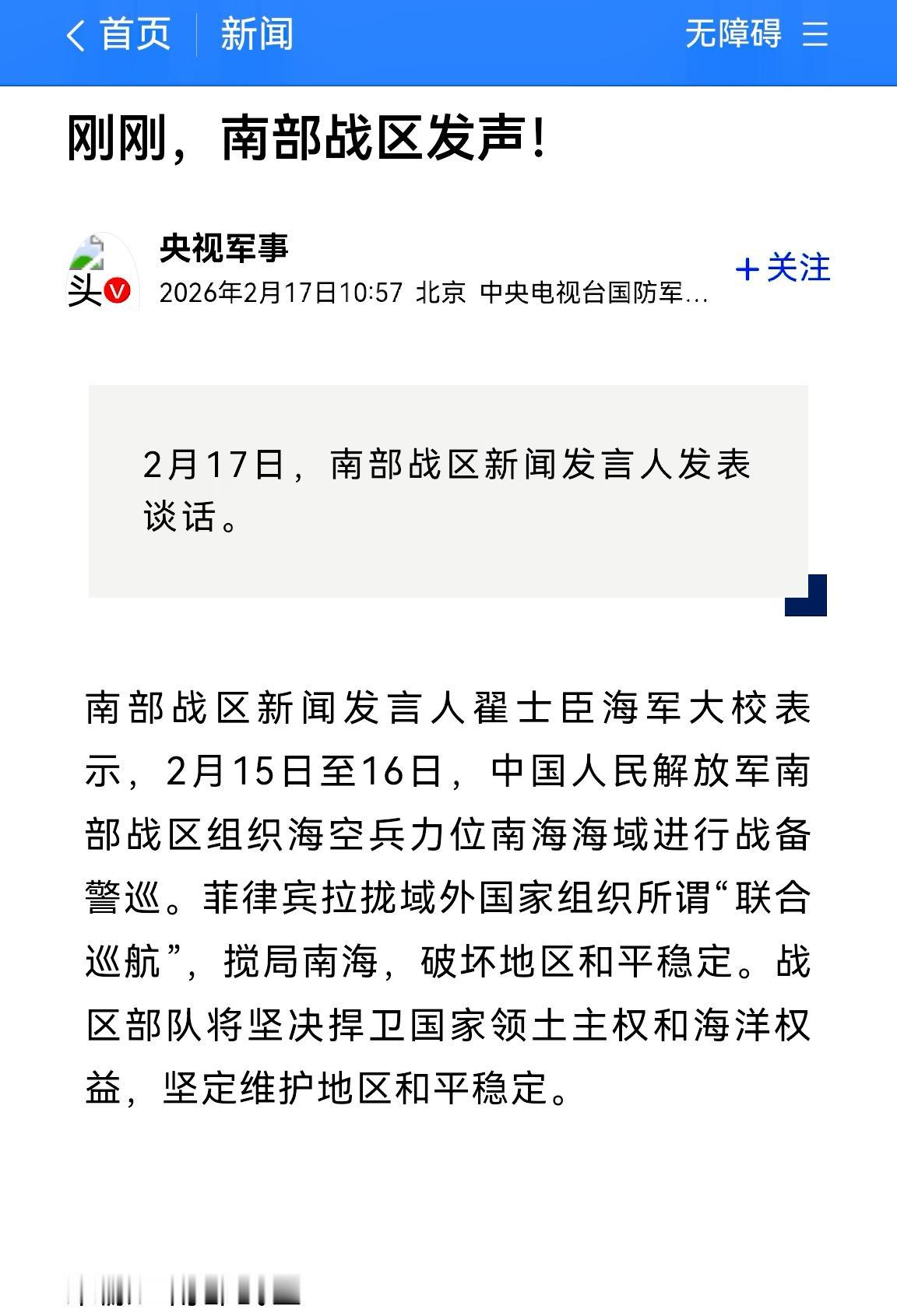 刚刚, 大年初一, 南部战区发声! 就是针对菲律宾、美国、澳大利亚三个国家,所谓的“联合巡航”。 菲律宾把南海局势扩大化,甚至,拉拢域外势力,把南海局势搞成国际化,真是不知深浅的搅局者,我们绝不惯着他,该出手就出手,一定硬起来! 菲律宾搅局南海 南部战区发声记录我的2026 国际观察今日热点 追梦人HZ