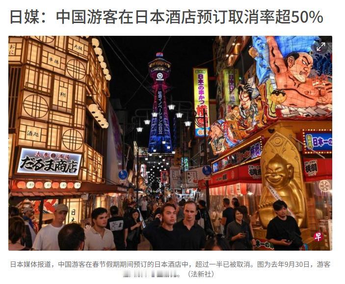 中国游客在日本酒店预订取消率超过50%? 不多嘛,不是还有40%多没有取消吗? 这点量对日本的经济有什么影响? 再说了,没有中国游客还有其他的地方的游客嘛。 何况就算没有了旅游业,还有其他的行业嘛。 比如家电,哦,家电现在竞争不过中国了哈。 比如电子,哦,电子产业现在也竞争不过中国了哈。 比如汽车,哦,中国现在汽车出口世界第一,日本没有新能源车哈。 那还有什么?哦,风俗业,这个是他们的传统产业了。 所以日本还是有活路的。[笑哭] 点右上角关注我,我们一起去看这个魔幻的世界