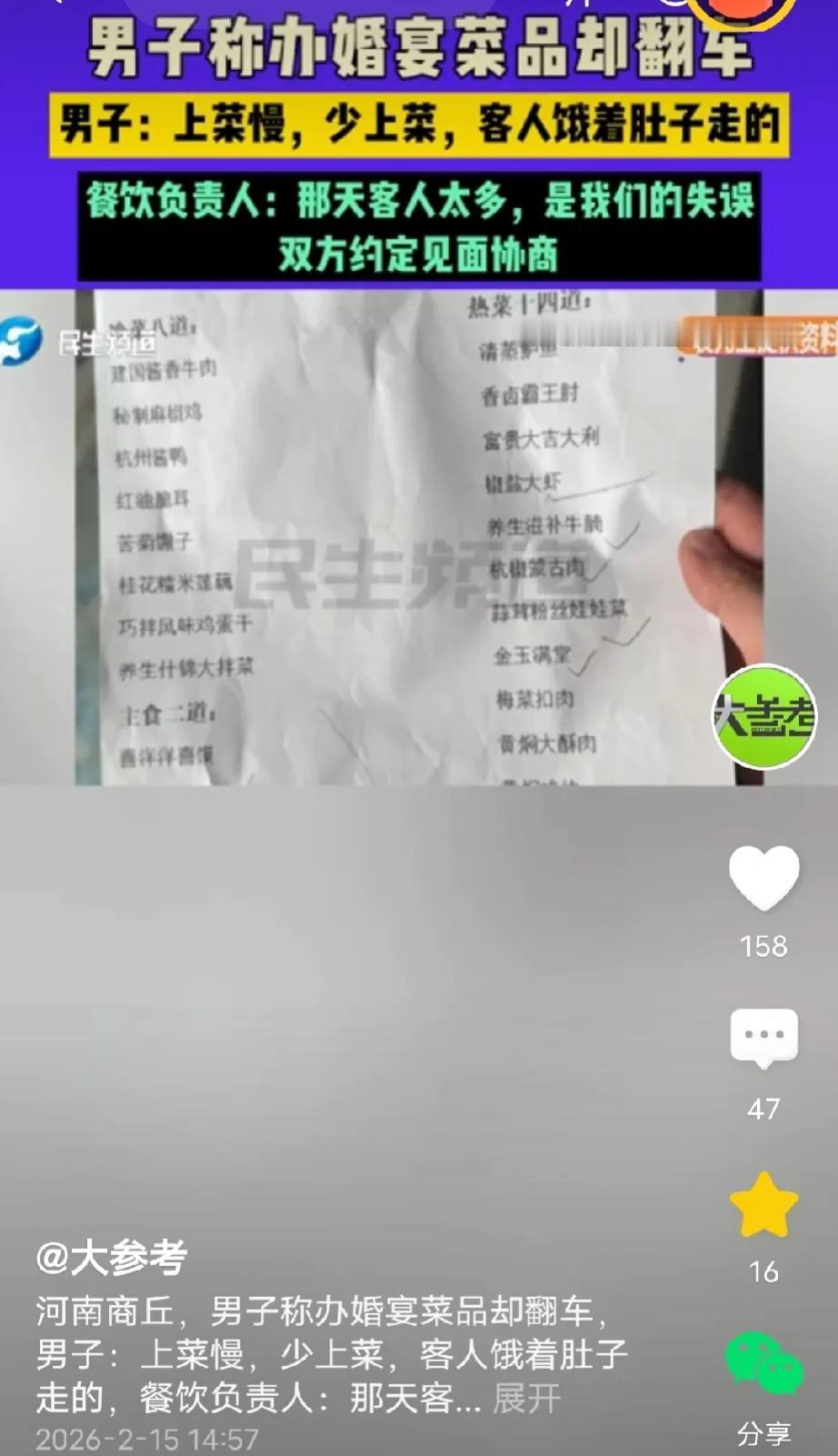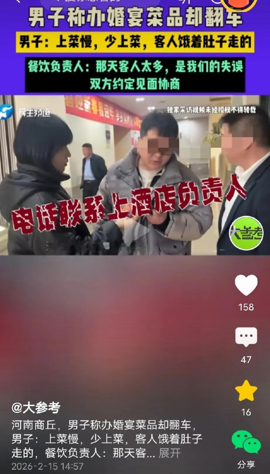 史上最糟糕的酒席!河南商丘,男子举办婚礼,在酒店订了799元52桌菜,包含8套冷菜菜、14套热菜和2套主食一共24个菜,谁料,吃席时,酒店不仅上菜慢,还少上了8套菜,八宝饭端上来是结块的,扣肉是人家吃剩的,根本没法吃。男子气愤不已找媒体哭诉:我们家脸面都丢尽了,客人是饿着肚子回去的,大家都说我抠门。最后酒店的做法让人意外。 河南商丘的袁先生找到记者一脸委屈地说,办这场酒席,我和我父母的脸都丢尽了。 他说来吃席的客人当着他面说,你看你们办的这是什么事,还有人在背后议论纷纷,说他们抠搜不舍得花钱。 原来今年2月13日,农历腊月26是袁先生结婚的日子。 那天他在某酒店订了52桌菜,宴请亲朋好友来共同见证他和爱人的幸福时刻。 菜品包过8套冷菜、14套热菜还有2套主食,一共24个菜,799元一桌,这是该酒店的特惠装。 这个酒席袁先生一家早在2025年5月份的时候就跟酒店预定了,之所以那么早就预定,一来是为了给酒店一方足够的时间去准备,二是为了让亲朋好友在婚宴当天吃好、喝好。 可让袁先生没想到的是,婚礼当天酒店做法却让他们大失所望,甚至颜面扫地。 当天中午12点左右,亲朋好友陆陆续续来到酒店,一开始大家都很开心、热情,满心欢喜地等着上菜,12点半准时开饭了。 谁料,在吃饭的时候,酒店服务员上菜特别慢,端完一套菜上来,要隔很久才上下一套菜。 那餐饭一直从12点半持续到2点50才上完菜,而且他们端上来的很多原本标注是热菜都冷了,八宝饭也结成一块一块的根本没法吃,那扣肉一看很明显就是人家吃剩的。 袁先生一看真想当场发火,可那天毕竟是他大喜的日子,为了不扫大家的兴致,他强忍着。 再看看客人的脸从最初的欢喜变成了一言难尽,袁先生真是气不打一处来。 那餐饭从12点半吃到到3点半终于结束了,客人们是带着无奈和不悦离开的。 有心直口快的亲戚在离开酒店前直接跟袁先生说,你看你们办的这是什么事,没有一个人是吃得饱了再回去的。 袁先生和父母站在门口尴尬地目送亲朋好友离去,心里五味陈杂。 最让他们觉得对不住的是袁先生老婆的娘家人,他们是从江西开几百公里的车过来参加婚宴的,也是饿着肚子回去。 好好的一场婚礼,被酒店这么一搞,一家子都觉得糟糕透了。 婚礼结束袁先生的老婆一直走不出来,她觉得很对不起自己的娘家人,他们从那么远的地方过来却饿着肚子回去。 事后袁先生找酒店负责人,他们却相互推诿扯皮,不愿意站出来承担责任。 所以,袁先生才找到媒体,想借助媒体的压力,让酒店承担责任。 记者跟着袁先生来到酒店,餐饮负责人接待了他们。 袁先生希望酒店能给自己一个说法,餐饮负责人说,他们承认上菜是慢了一些,是因为当天来的客人太多。 记者问他酒席都是人家提前预定的,难道没有规划吗? 袁先生又透漏,除了他们遇到这种情况,当天另一家在那里办酒席的也跟他们有着同样的遭遇。 袁先生当场给当天也是在那里办酒席的新娘打电话,对方告诉记者,除了上菜慢,没上完菜,那个扣肉还有异味。 负责人听了直接辩称,他只是餐饮负责人,酒店的所有事不是他一个人说了算,然后告诉袁先生可以找他的经理。 这时经理刚好从楼上下来,袁先生拦住了她,经理说她在忙着招待客人,她会让另一个负责人接待袁先生,说完就想离开。 这时袁先生和记者拦住了她,让他们不要相互推脱。 记者也劝经理说,出了事就应该敢于承担,好好解决,这样对酒店后续的管理也好。 之后经理又给酒店总负责人打电话,对方说她在外地,正在赶回来,她回到商丘就主动找袁先生解决这个事。 面对这样离谱又糟心的情况,实在让人难以接受。 一辈子就一次的婚礼,被这家酒店彻底搞砸。提前大半年预定,本是想让宾客吃得满意,结果上菜慢、少上8道菜,热菜变凉菜,八宝饭结块,扣肉竟是剩菜还有异味。 远道而来的娘家人饿着肚子回去,新人全家被误会抠门,颜面尽失。 可酒店方非但没有愧疚之心,出了事只会互相推诿、找借口搪塞,没有半点担当和诚意。 拿别人终身大事当儿戏,服务差、菜品烂、态度更差,这样的酒店既寒了顾客的心,也亲手砸了自己的招牌,实在令人不齿! 出了这样的事,酒店应该承担哪些责任? 《民法典》第577条规定,当事人一方不履行合同义务或者履行合同义务不符合约定的,应当承担继续履行、采取补救措施或者赔偿损失等违约责任 。 袁先生与酒店成立合法有效的餐饮服务合同,酒店未按约定提供24道菜,少上8道,上菜极慢致热菜变冷,八宝饭结块、扣肉为剩菜且有异味,明显属于履行合同义务不符合约定,已构成违约。 酒店事后还相互推诿、拒不担责,袁先生可依据该法条要求酒店退还对应餐费、赔偿经济损失,还可主张因婚礼被搞砸、颜面尽失产生的精神损害赔偿。