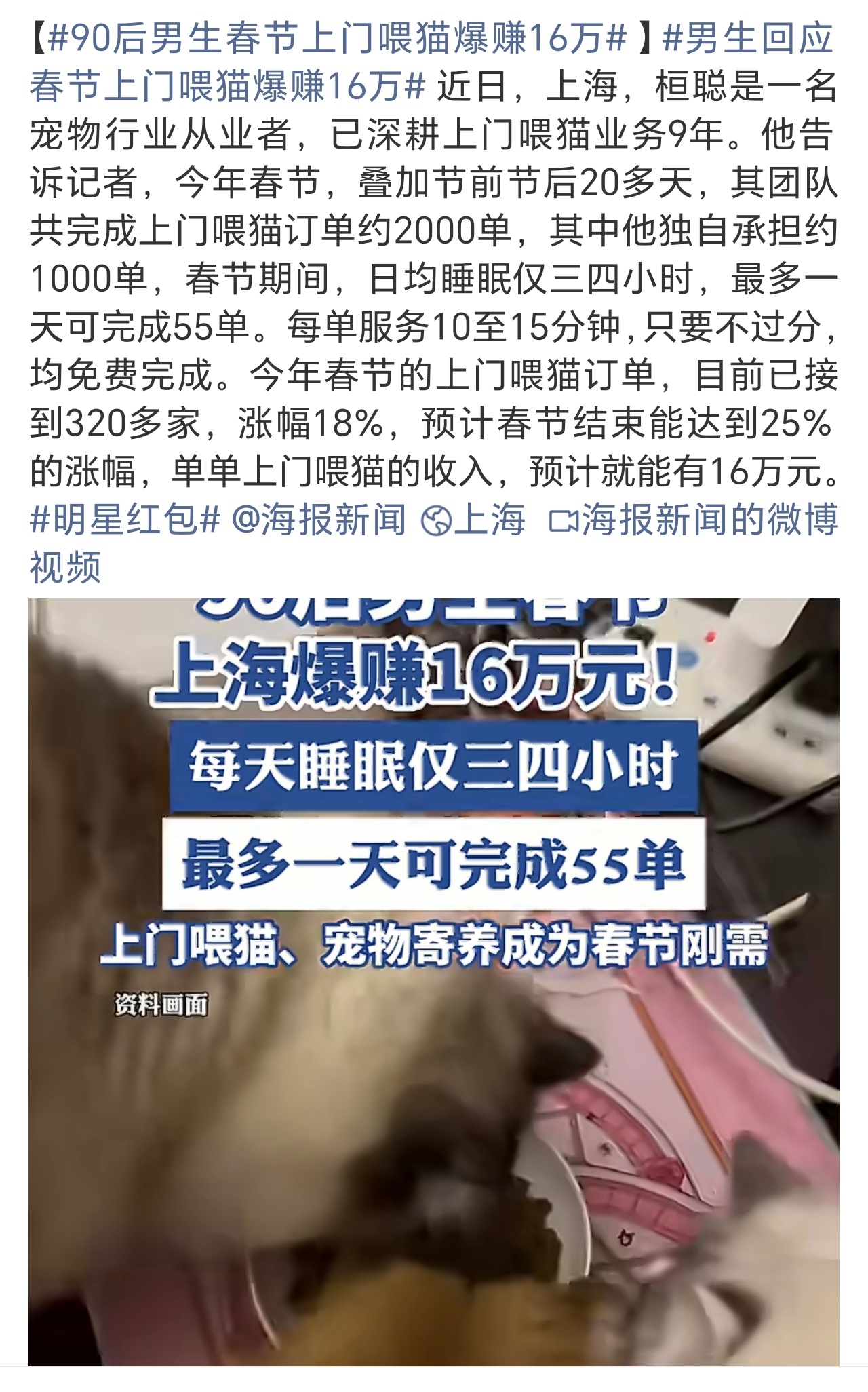 男生回应春节上门喂猫爆赚16万这新闻看的人一愣一愣的,AI写的也不能这么云山雾罩的吧…~