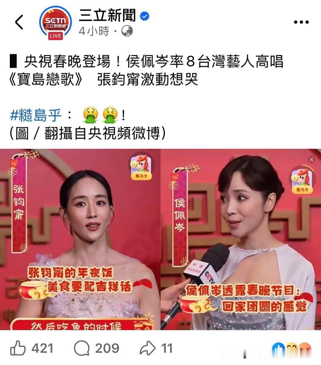 绿媒破防!气台湾艺人春晚唱统战歌曲! 昨晚的央视春晚可谓封神,除了相声小品类节目不搞笑外,其他节目都是看点多多,亮点满满!尤其是机器人武术表演震撼世界!但在台湾绿媒眼里,基本装死不提这个,它们却在生气台湾省艺人在春晚唱《宝岛恋歌》!