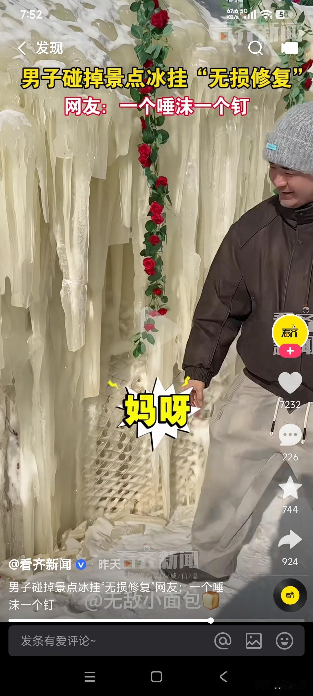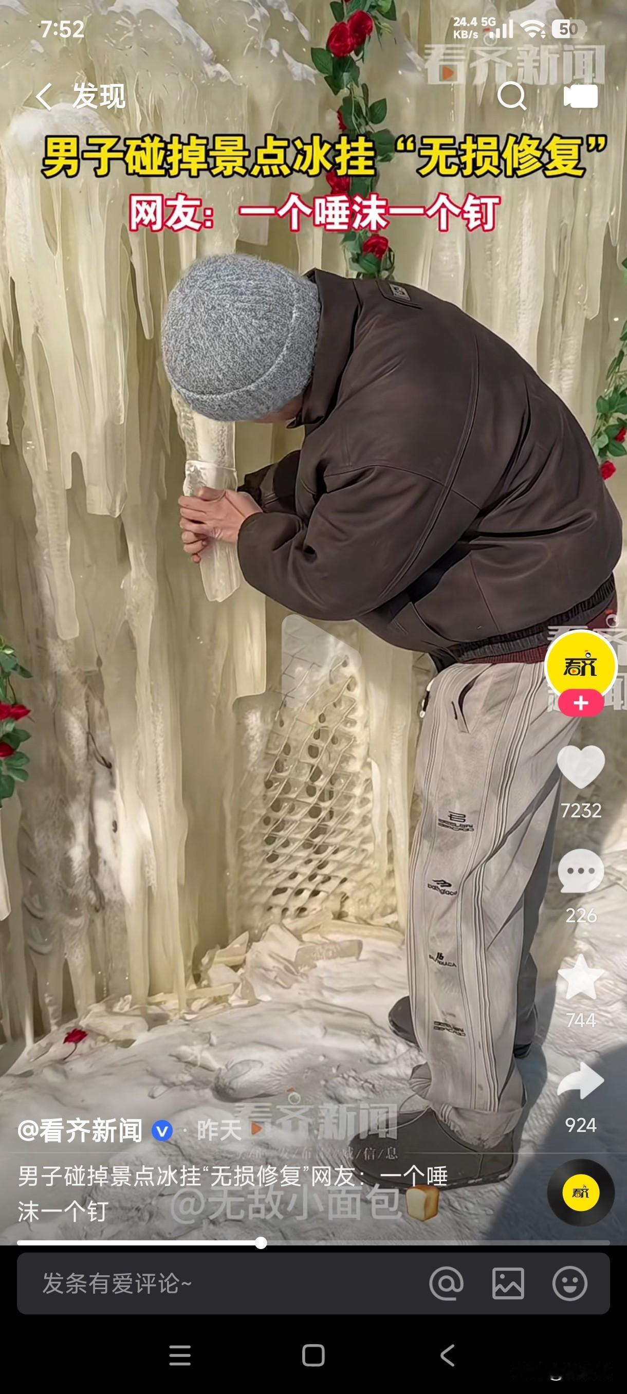 果然男人一口唾沫一个钉这是铁打的事实。 男子无意中碰掉景点的冰挂,他捡起掉在地上的那一段,当即吐了一口唾沫又随手给粘在上面了,这样无损修复的操作看的朋友也一脸懵逼,还有这样的操作?这是不是太厉害了! 这样的一幕既搞笑又可爱,冰挂断的也快,修复的也快,这老话看来说的一点都没错,男人一口唾沫一个钉,这都是经过实践检验证明的不是吗?