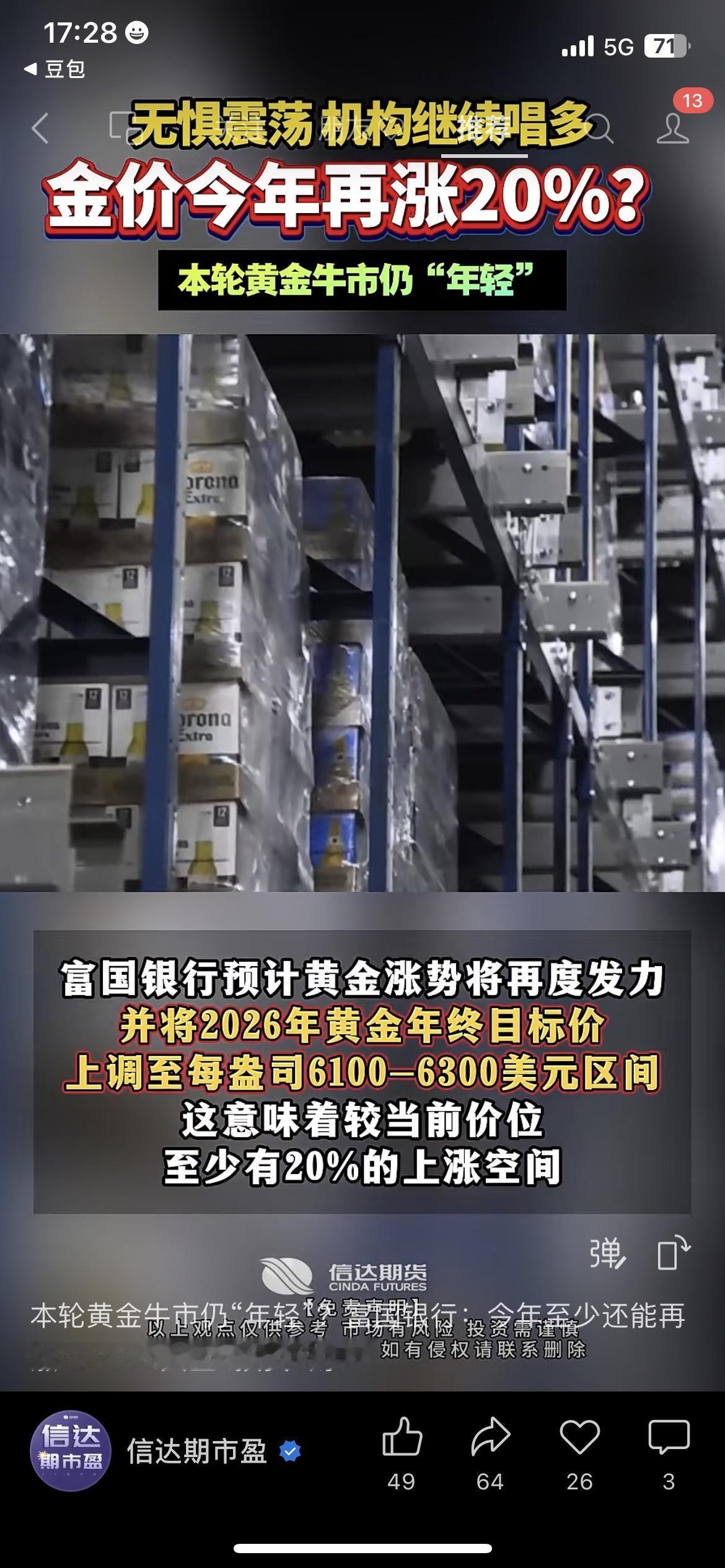 最近问黄金的朋友真的太多了! 涨了怕追高接盘,跌了怕踏空错过行情,机构最新的观点,给大家说句掏心窝的大白话。 富国银行直接把2026年黄金的年终目标价,上调到了6100-6300美元/盎司,预判较当前价位还有差不多20%的上涨空间,还明确说现在的震荡,是布局的机会,不是跑路的时候。 还有BCA的观点也很实在:这轮黄金牛市还很年轻,全球央行一直在买买买托底,根本没到顶。 咱普通人记住一句话:黄金是用来给你兜底守本金的,别瞎折腾炒短线。 温馨提示:以上为机构公开观点整理,不构成任何投资建议,市场有风险,投资需谨慎。 你今年有买黄金的打算吗?还是觉得现在点位太高不敢进? 黄金投资 金价走势 普通人理财 理财干货