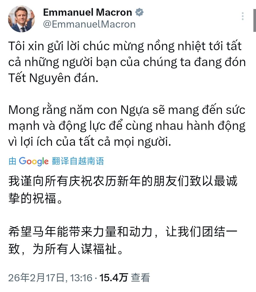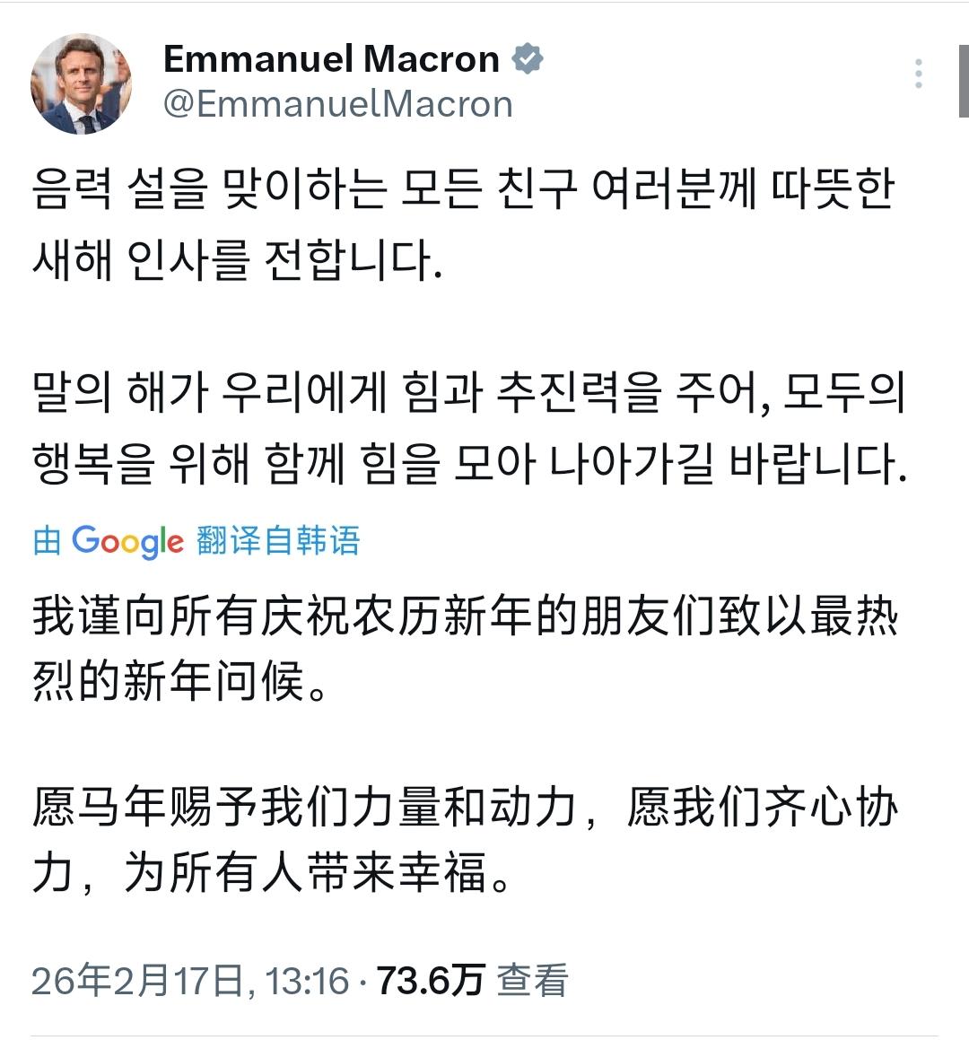 法国总统马克龙今天(北京时间2月17日)用四种语言送出祝福语。马克龙的中文版本写道:“我向所有庆祝农历新年的朋友们致以最诚挚、最温暖的祝福。愿这马年带来力量与动力,让我们携手努力,造福众人。” [机智]评几句:马年马克龙用四种语言送上新春祝福,姿态不可谓不积极,中文祝福也显得诚意十足,但中法关系要真正走稳走远,不能只停留在节日表态和漂亮话术上,更需要拿出实际行动。希望马克龙能少一些政治作秀与对华双重标准,多一点战略清醒和务实理性,在经贸、科技等领域坚持互利共赢,不被外部势力裹挟搞阵营对抗,说到做到、言行一致,才能让中法关系真正获得动力,而不是停留在节日里的一时热闹。