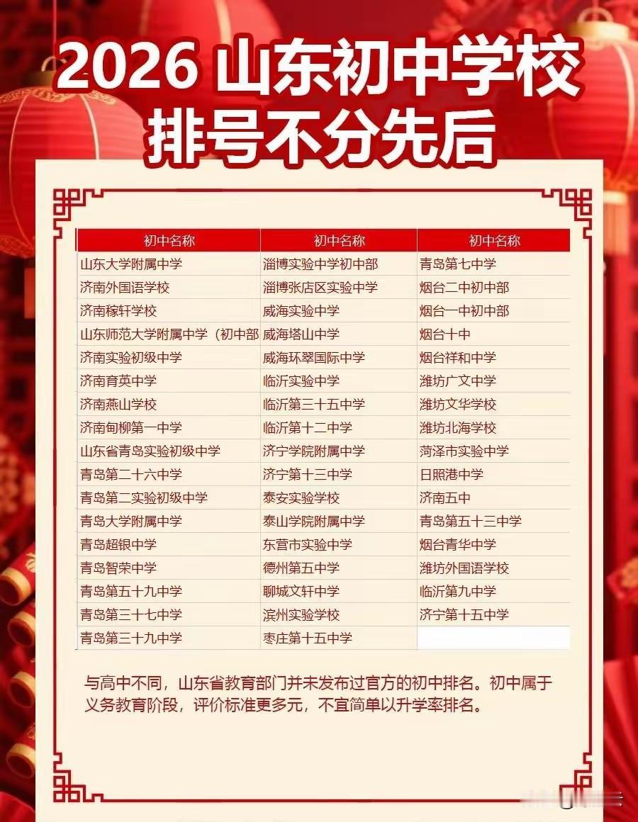 山东省初中学校排行榜前50名!2026山东初中TOP50出炉!齐鲁学霸天团强势出圈!2026山东省初中前50强火热发布,齐鲁大地名校云集,堪称少年学霸集中营,文风与实力双在线,上演神仙打架。速速围观揭秘详细内容![烟花][烟花][爆竹][爆竹] 山大附中稳居榜首,济南稼轩、济南外国语紧随其后;青岛实验初中、青大附中、超银中学强势霸榜,济青双城领跑全省。潍坊、烟台、临沂等地强校扎堆入场,县域黑马频频逆袭,公办民办同台竞技,升学率直接拉满。[爆竹][爆竹][福][福] 数据显示,前50强重点高中录取率遥遥领先,推荐生名额“手慢无”,师资与学风双向内卷。正如“长风破浪会有时”,少年们执笔为剑,在题海里乘风破浪,在青春里一路开挂。[大笑][大笑] 全省教育格局均衡发力,济南稳坐头把交椅,青岛紧随其后,鲁东鲁中多点开花。这不仅是排名的较量,更是梦想的启航,愿齐鲁少年以梦为马,不负韶华,奔赴属于自己的星辰大海。[烟花][烟花][点亮平安灯][点亮平安灯] 欢迎关注@叮咚云 将优先为粉丝职业规划指导,1对1咨询是付费服务,为你定制最适合的就业择业方案!欢迎留言交流讨论。[来看我][来看我] 免责声明:图片来自网络,仅供参考! 央国企招聘国企招聘全国大学梯队 高校梯队排名 山东院校之最