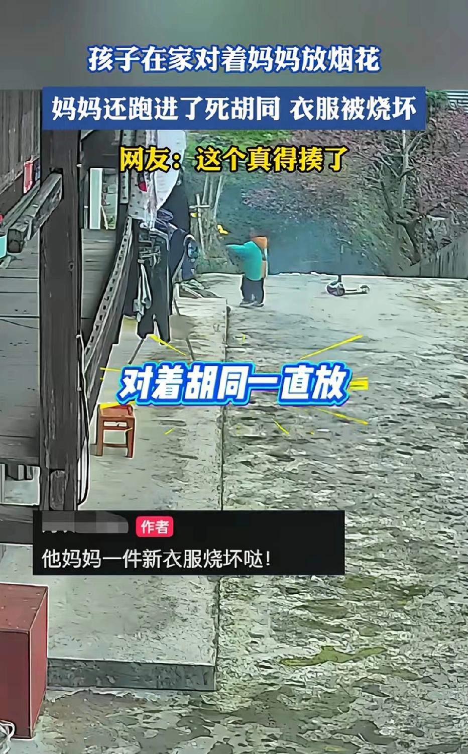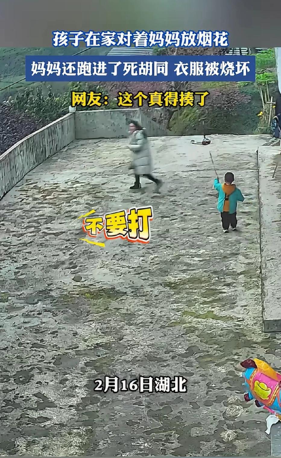 近日湖北武汉,一5岁男孩在家门口放烟花,点着火后,他没有对着空旷的地方,反而将烟花朝着妈妈放,这直接吓傻了妈妈! 男孩妈妈叫他不要对着她放,他一点没听,反而追着妈妈跑,妈妈左右闪躲,最后跑进了一条死胡同里,男孩追了过去,对着胡同一顿乱放,男孩妈妈的身上的新衣服被烧坏了!提醒广大家长,春节期间,孩子放烟火火炮一定要注意安全!