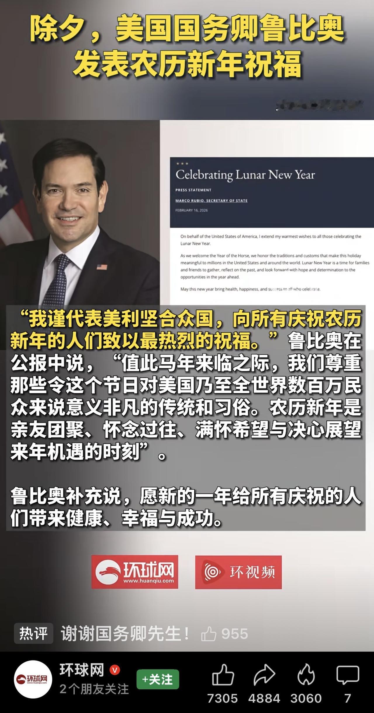 这是鲁比奥连续第二年以国务卿身份在除夕发表农历新年祝福, 去年的祝福发布于1月28日。此举属于美国高级官员延续的外交礼节,旨在认可和尊重美国及全球范围内庞大的亚裔和庆祝农历新年的社群,体现了文化多元性,也是公共外交的一部分。在当前的国际关系背景下,这一姿态也被视为维系基本文化交流的常规动作。