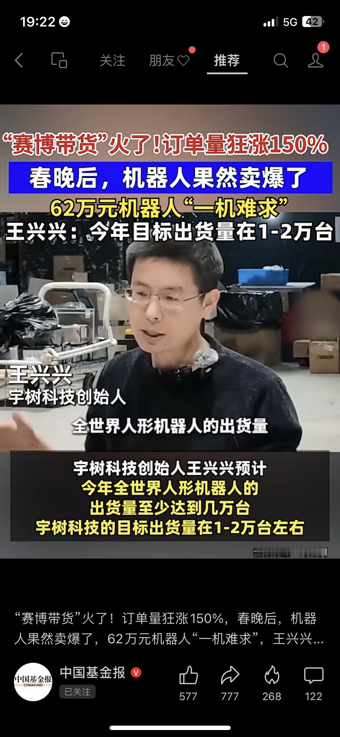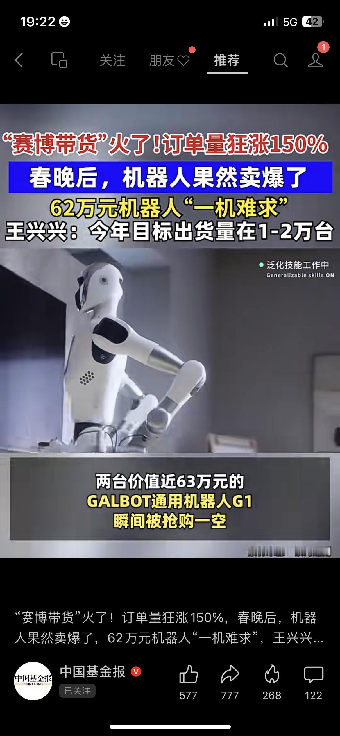 今年春晚机器人直接火出圈,京东数据显示,机器人相关搜索量暴涨超300%,订单量环比增长150%,不少机型出现快速售罄的情况。 很多人第一反应就是:这是不是又在炒概念? 说实话,春晚从来都是放大器,不是发动机。 真正能走得远的,一定是能落地、有订单、能商业化的方向。 对咱普通人来说,最稳妥的方式,就是不追高、不赌单票,用指数基金分批布局,既分享赛道成长,又能分散风险。 科技赛道波动大,机会多,但一定要守住底线: 不盲目跟风,不梭哈,长期拿得住,才更容易赚到钱。 市场有风险,投资需谨慎。 春晚机器人 人形机器人 新质生产力 基金理财春节晚会机器人