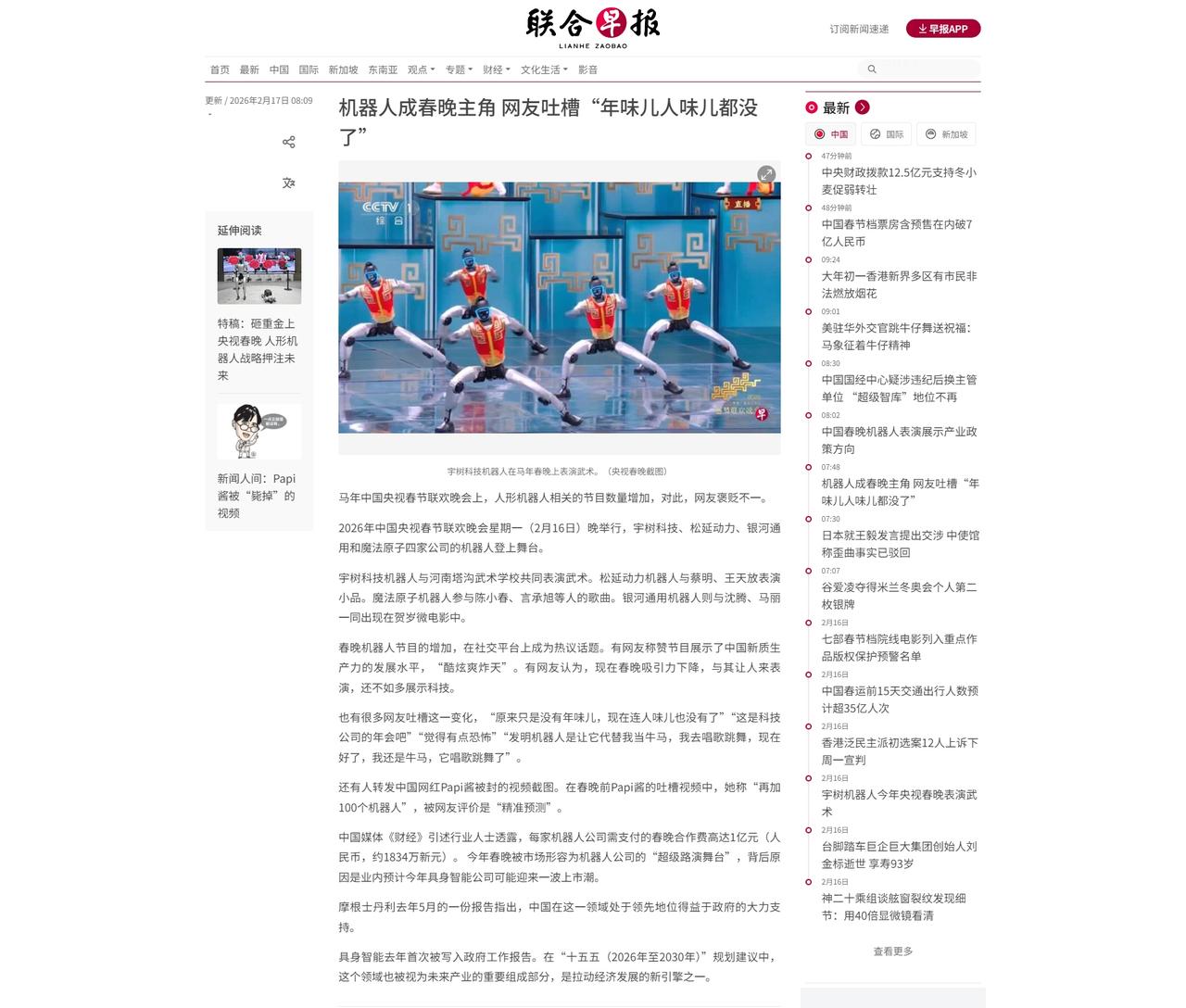 吃不到葡萄说葡萄酸,连过年都要添堵。 我们办了场科技含量很高的春晚,刺激到外媒的神经了,他们心里不爽,对我们的科技进步各种阴阳怪气,揶揄我们的春晚没有人情味儿,要是西方办这样一场科技春晚,肯定会吹上天。 我记得当年波士顿动力推出机器人时,被他们吹上了天,现在西方被我们一众科技企业碾压了,他们心里很不爽。其实,这都是酸葡萄心理在作祟。 至于是哪些外媒,我就不点名了。