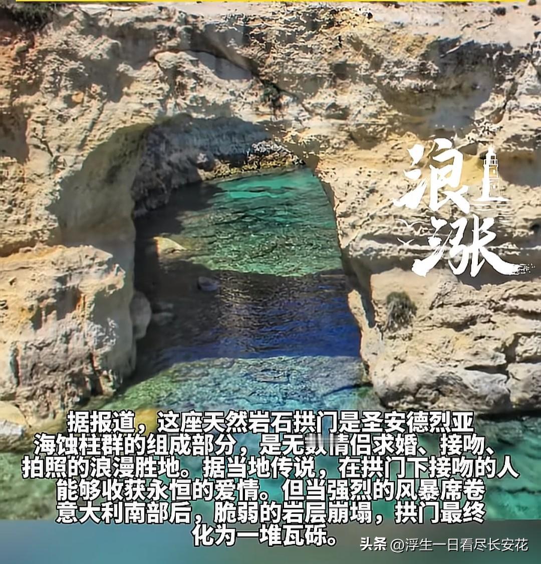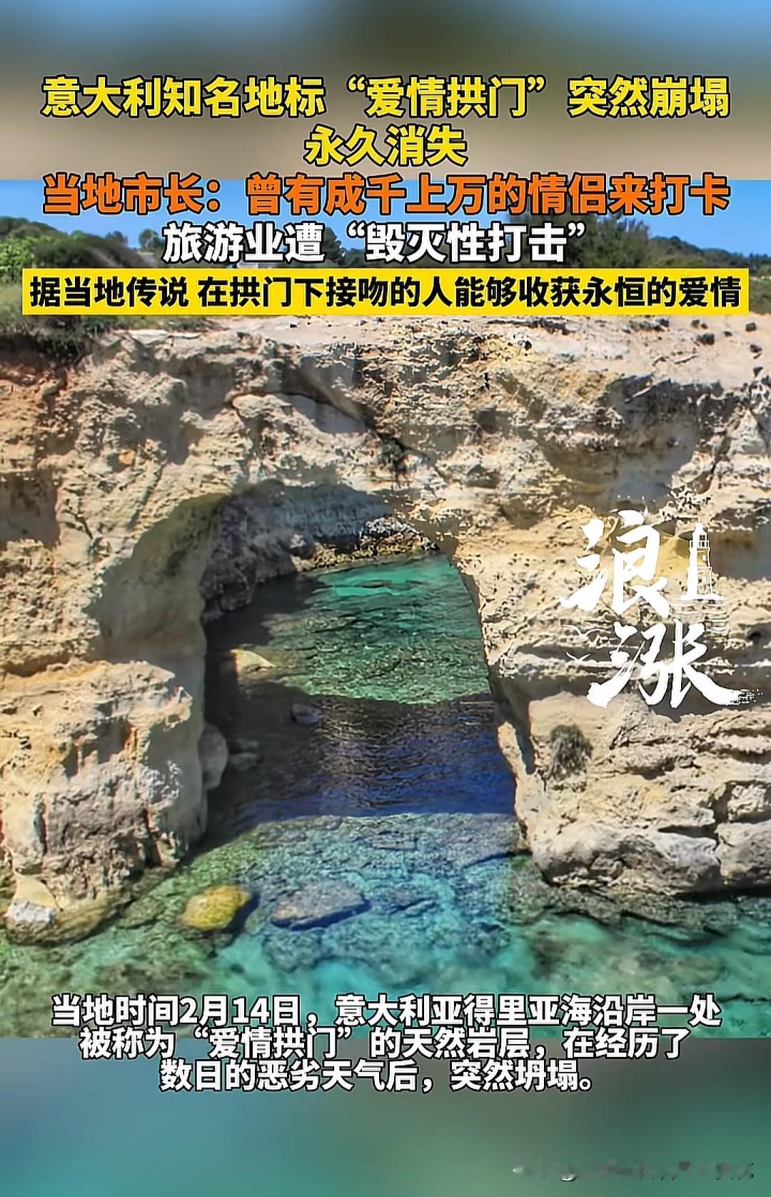 意大利的“爱情拱门”地标没了,也不可能再有了,永远的消失了!受强烈的风暴影响,“爱情拱门”不堪一击,直接化为一堆瓦砾。事实证明爱情经不起考验,也没有永恒,平平淡淡才是真,顺其自然才是王道。 据了解,该地标位于意大利普利亚大区梅伦杜尼奥镇海岸,是天然海蚀拱门,当地传说情侣在拱门下亲吻可获永恒爱情,曾是热门浪漫打卡地,但于2026年2月14日因极端天气坍塌。因为此事,当地旅游业深受打击,很多情侣不会再来此地打卡。 有人提议,为何不上点混凝土,自己造一个不就完了吗?如果随便造个就完事了,“爱情拱门”就失去独特性和神秘性了。对于追求“自然奇观”的游客来说,混凝土补出来的拱门不仅失去了灵魂,更像是一场视觉尴尬。
