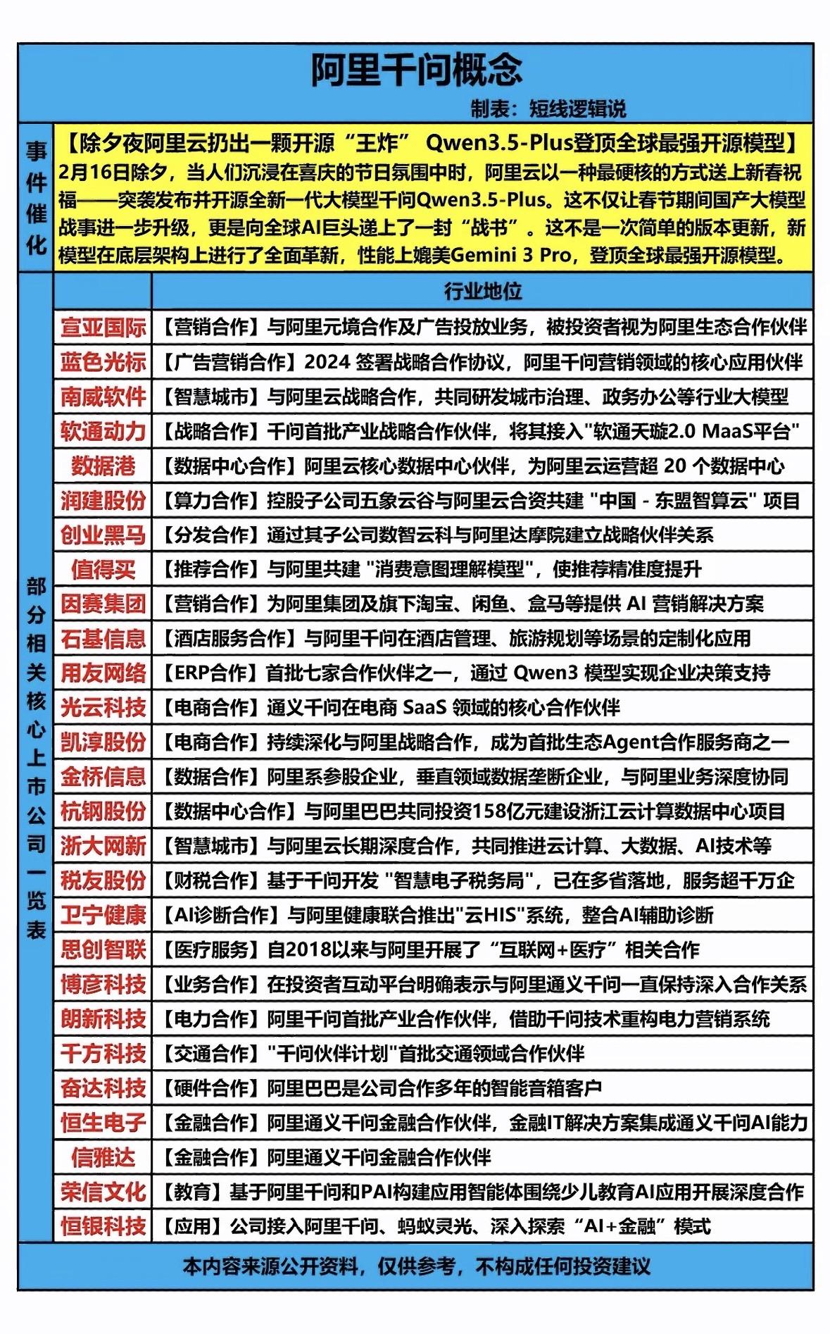 阿里千问是阿里基于Qwen模型打造的面向大众的AI助手APP,对标ChatGPT,本质是阿里争夺“AI入口”的利器。它背靠淘宝、天猫等,有强大商业资源,核心是“AI + 商业应用”,擅长“会办事”,像帮用户比价、选商品等。 在A股市场,阿里“千问”概念可是近期最火的主线之一。通义千问App“30亿免单”活动让它登顶App Store免费榜,引爆市场情绪。关联紧密的股票有三类,算力基础设施类如数据港、中际旭创、浪潮信息;阿里生态与深度绑定类如石基信息等,都因千问有了不错表现。
