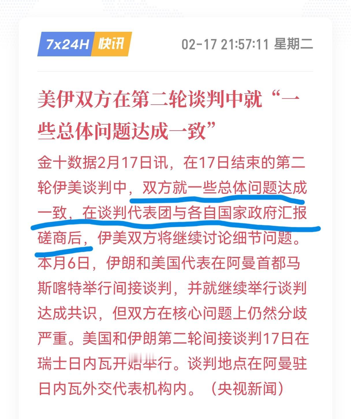 美伊谈判第二轮有结果了, 达成了总体共识,一面是进展乐观,一面是困难在后头,一方面很奇怪! 伊朗外长刚表态,说这次日内瓦谈判气氛不错,双方已经就谈判的“总题达成一致”。这相当于先把框架定下来,为后面正式谈协议铺路,算是个双方谈判积极的信号。 但别高兴太早,他也强调这不代表协议马上就能成。还要各自回去商讨磋商! 奇怪的是,从资讯上看都是伊朗外长在说此次谈判有共识,那美国觉得满意吗? 目前下一轮谈什么、什么时候谈,都还没定。