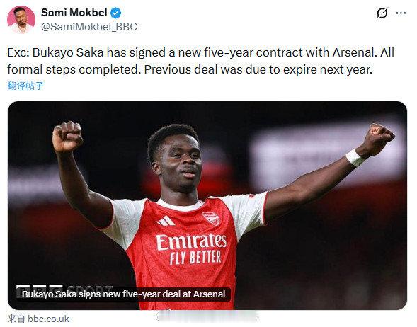 【萨卡与阿森纳续约5年】BBC名记Sami Mokbel独家消息:经过数月的谈判,24岁英格兰国脚萨卡,已经与阿森纳续签了一份5年新合同,续约的所有步骤全部完成,即将官宣!萨卡原合同,在2027年6月到期。