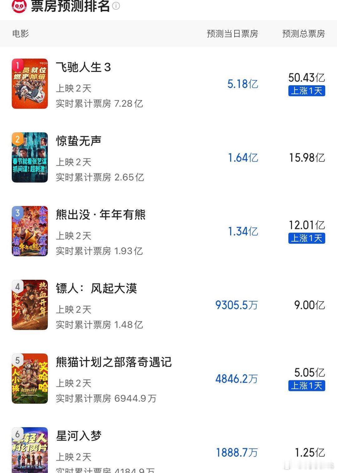猫眼春节档电影最新预测《飞驰人生3》50亿《惊蛰无声》15亿《熊出没年年有熊》12亿《镖人》9亿 《熊猫计划》5亿《星河入梦》1.25亿