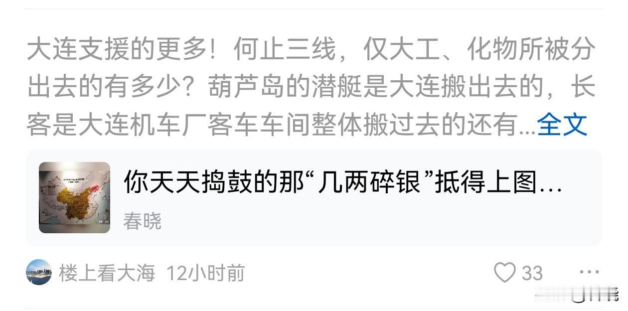 大连的兄弟们好好管管这个人吧!天天办给大连减分的事儿。 这个人为了黑,已经到了靠造谣说谎了,真是给大连人丢大脸了。 ~人家长春客车中国第一家,跟你大连有个啥关系? ~人家葫芦岛潜艇跟你大连毫无关系! ~人家长春光机自1953年成立以来一直扎根长春,你家管有合作交流叫援建? ~你也有胆提大学?自己查查大连理工有没有从东北大学拿资源?大连理工的数学、物理、化工、地质全都是东北大学资源,其中化工对大连理工的对应学科起到奠基作用,你还好意思提大学? 你懂什么叫“援建不?以上都跟援建八竿子打不着,懂吗? 沈阳是整个工业基础链支援国家三线建设,包括工厂、技术人员、物料等等,仅技术人员就达数万,自己看看全国三线地区多少沈阳乡音,有几个大连口音的?这都是国家背书的实在数据,你的数据在哪儿?靠你一张嘴意淫?有空到沈阳的“中国工业博物馆”看看,学习学习,天天无脑吹牛逼、自嗨有意思吗? 提到三线援建,沈阳一市抵全国。懂吗?@楼上看大海