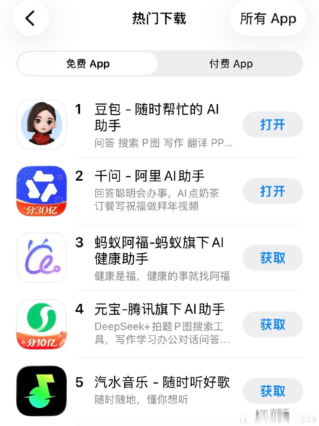 【豆包AppStore排名第一】 2月17日,App Store中,豆包App排名反超阿里系的千问、蚂蚁阿福,上升至第一名。今日字节跳动方面披露,除夕当天豆包AI互动总数达19亿。