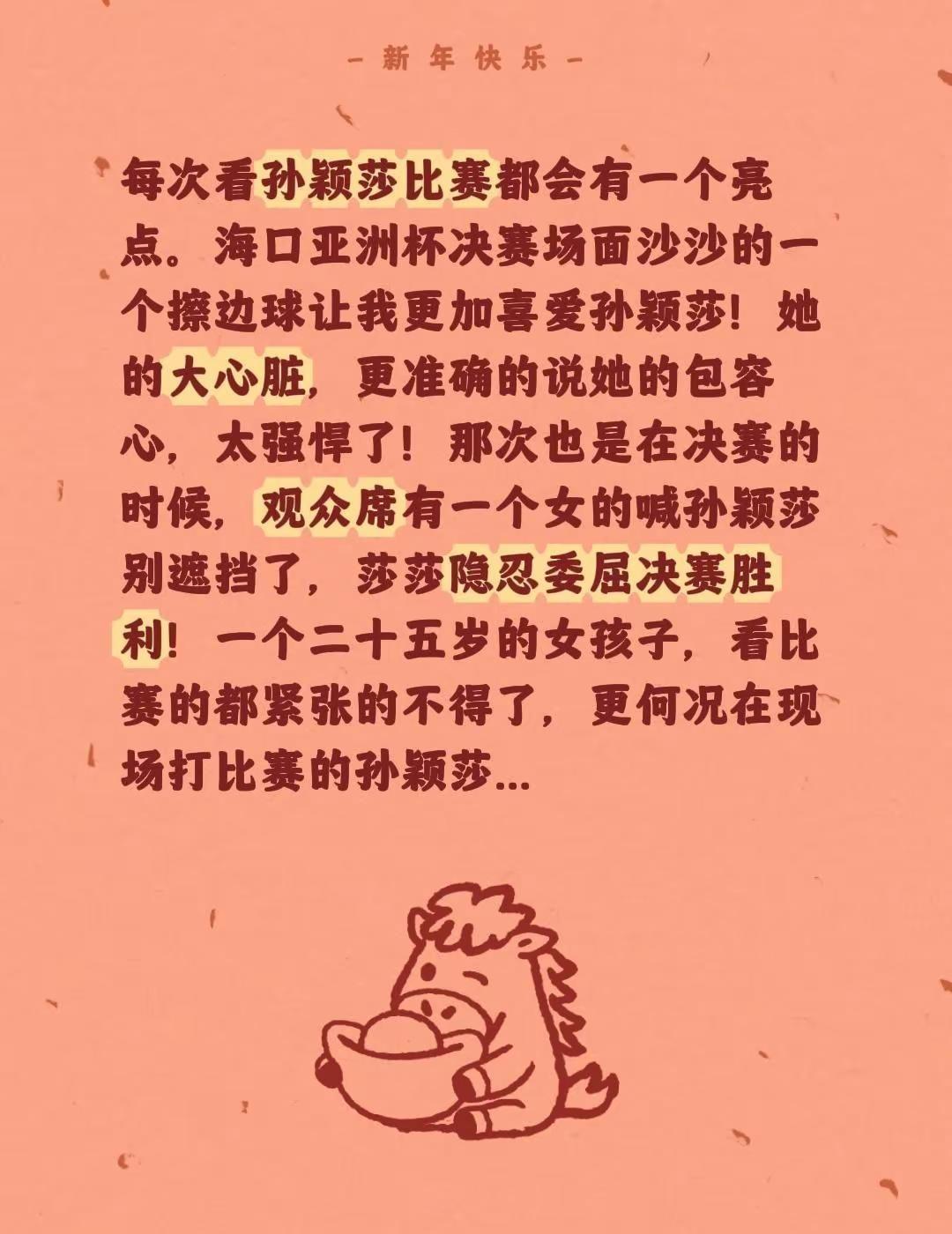 每次看孙颖莎比赛都会有一个亮点。海口亚洲杯决赛场面沙沙的一个擦边球让我更加喜爱孙颖莎!她的大心脏,更准确的说她的包容心,太强悍了!那次也是在决赛的时候,观众席有一个女的喊孙颖莎别遮挡了,莎莎隐忍委屈决赛胜利!一个二十五岁的女孩子,看比赛的都紧张的不得了,更何况在现场打比赛的孙颖莎。在那种情况下,换位思考一下。假如说是我们自己。那心态能稳得住吗?我真的很敬佩她!