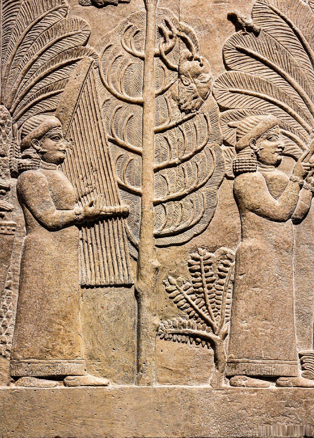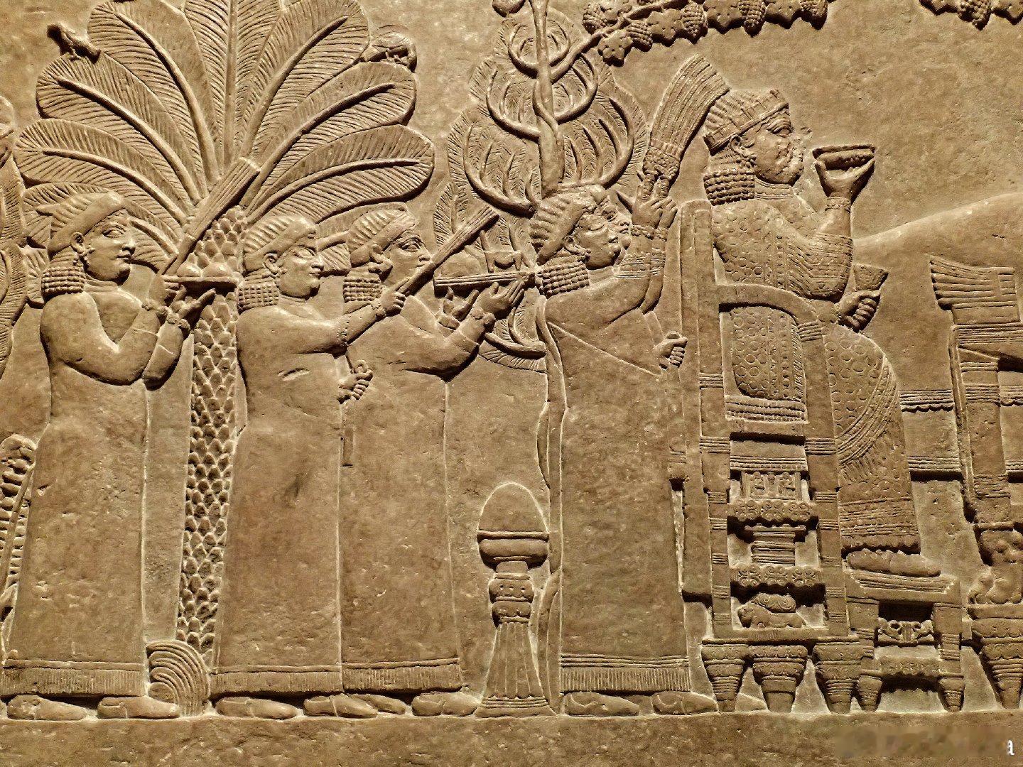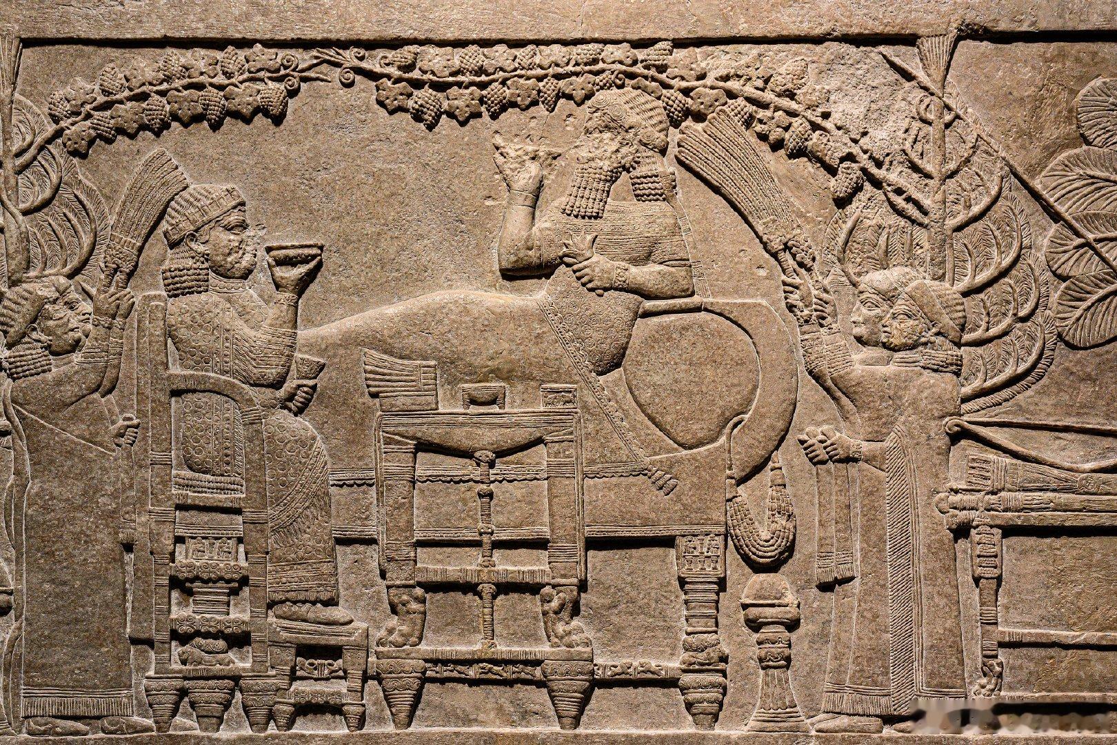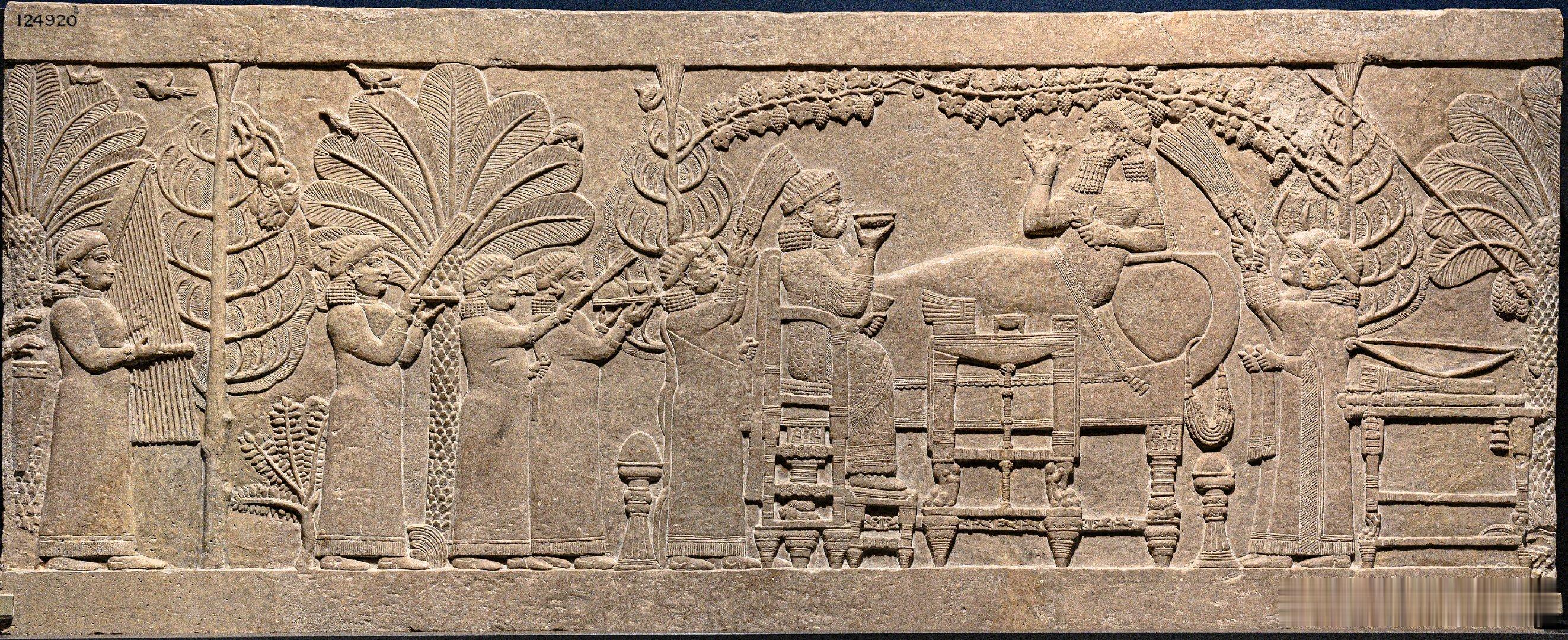历史知识 大英博物馆收藏的《亚述巴尼拔的宴会》,出土于尼尼微的皇宫遗址,年代为公元前645-前640年间。浮雕展现了亚述巴尼拔在花园中的宴会,万王之王躺在卧榻上,对面高背椅上的是王后利巴利-沙拉特。侍从侍女们簇拥着两位贵人,远处有乐师奏乐。最悚然的是左边的树上还挂着埃兰国王特曼的首级。公元前653年亚述在乌莱河战役中彻底击败埃兰军队,将特曼斩首,首级作为战利品被送回尼尼微。亚述巴尼拔在位期间亚述的文治武功都达到了巅峰,这一浮雕可作为生动的物证。
