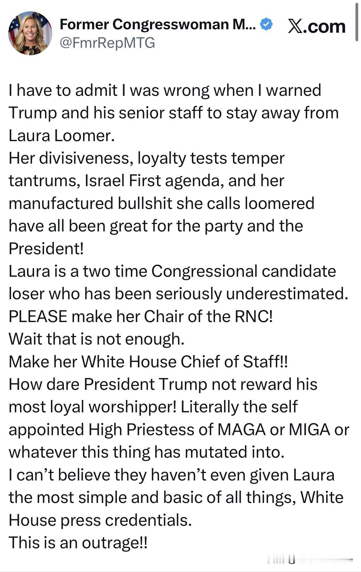 两个曾经的同壕战友、MAGA的铁粉在网络互相谩骂和攻击 保守派自媒体人劳拉·卢默发文称:前共和党众议员马乔里·泰勒·格林希望特朗普带领的共和党输掉中期选举。 马乔里·泰勒·格林立马回文讽刺劳拉·卢默铁杆支持特朗普至今,连白宫记者证都没有!她的帖文全文: “我不得不承认,当我警告特朗普和他的高级员工远离劳拉·卢默时,我错了。 她的分裂、忠诚测试发脾气、以色列第一议程,以及她所谓的胡言乱语,对党和总统来说都是很好的! Laura是两届国会候选人的失败者,她被严重低估了。 请让她担任共和党全国委员会RNC的主席! 等等,这还不够。 让她成为白宫幕僚长!! 特朗普总统怎么敢不奖励他最忠诚的崇拜者!从字面上看,是MAGA或MIGA的自封大祭司,或者不管这个东西已经变异成什么。 我不敢相信他们甚至没有给劳拉最简单、最基本的东西,白宫新闻凭据。 这太令人愤慨了!!”