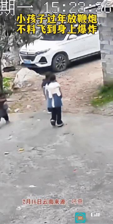 这是一个二踢脚,第一次“响”,就崩到了他的身上;第二次“响”就是在他的身上炸的。 估计是伤着,不然,女子抱着他不会跑的那么快! 点燃二踢脚的孩子事后不知会不会挨揍……