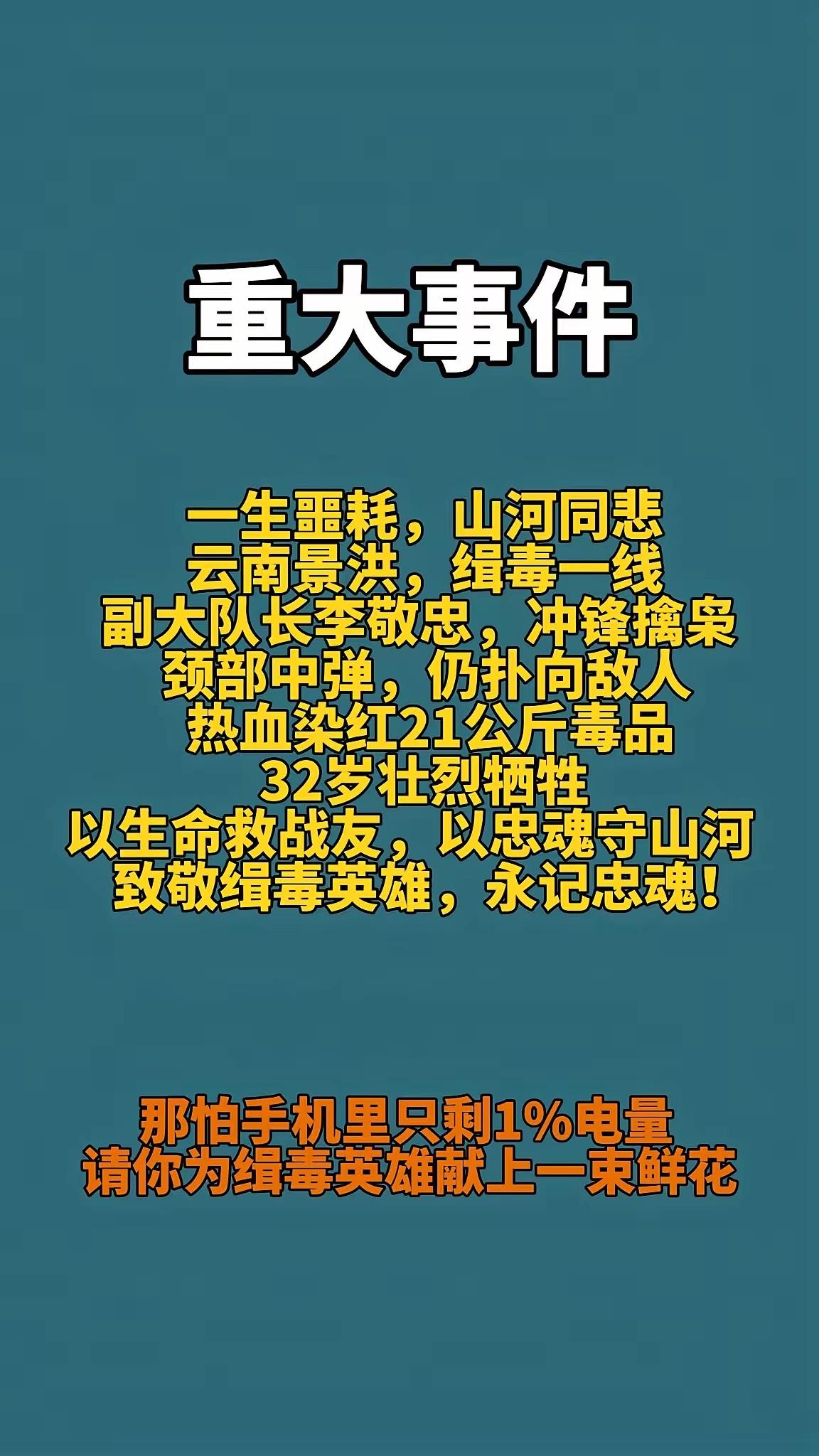 一生噩耗,山河同悲,云南景洪,缉毒一线,副大队长李敬忠,冲锋擒枭,颈部中弹,仍扑向敌人 热血染红21公斤毒品,32岁壮烈牺牲,以生命救战友,以忠魂守山河,致敬缉毒英雄,永记忠魂!致敬一线工作人员 致敬英雄 人民子弟兵在负重前行 这事儿得从头说起。2016年11月4日那天,云南西双版纳的景洪市,空气里还飘着那股子热带雨林特有的潮湿味儿。李敬忠带着他的兄弟们,已经盯上这伙毒贩子好一阵子了。这帮人要交易21公斤冰毒,数目不小,够枪毙好几回了。情报摸得差不多了,收网的时候到了。 抓捕地点选在景洪市景哈乡的一处偏僻窝棚。这种地方,毒贩子最爱选,前不着村后不着店,跑起来方便,打起来也没顾忌。李敬忠当时是景洪市公安局禁毒大队的副大队长,32岁,正是干事的年纪。他冲在最前面,这不是逞能,是规矩——当队长的,危险时刻就得挡在弟兄们前头。 枪战来得突然。毒贩子里头有个叫岩某的,亡命之徒,摸出枪就开火。第一枪就打中了李敬忠的颈部,锁骨动脉被打穿,血喷涌而出。正常人挨这一枪,立马就得倒。可李敬忠没有,他硬是撑着扑向了岩某,给身后的战友争取了那宝贵的几秒钟。这几秒钟,够战友们反应过来,够他们把枪掏出来,够他们制服剩下的毒贩。李敬忠倒下的时候,身下还压着那21公斤毒品,血渗进去,把白色的冰毒染成了暗红色。 送医院的路上,人就不行了。32岁,正当壮年,家里头还有老婆孩子。他最后那一下扑出去,不是本能,是选择。干禁毒的,哪个不知道脖子中枪意味着什么?他清楚,但他更清楚,自己多撑一秒,身后的兄弟就少一分危险。 说起李敬忠,得提提他的来路。景洪这地方,挨着缅甸老挝,金三角的毒贩子跟蚂蟥似的,赶都赶不完。李敬忠从警12年,参与破获的毒品案子堆起来能有一人高。2012年有个案子,他带队去堵一辆运毒的大货车,对方直接开车撞过来,他侧身躲过,愣是把司机从驾驶室里拽了下来。这种事儿,干一次是运气,干一辈子是本事,也是命大。可运气总有用完的一天。 禁毒这行当,有个不成文的规矩:牺牲同志的照片可以公开,活着的必须打码。李敬忠牺牲后,他的照片终于能露脸了,可人也已经没了。这规矩听着心酸——活着的时候连脸都不敢露,死了才能堂堂正正让人看一眼。2017年,他被追授"全国公安系统一级英雄模范",骨灰安葬在西双版纳的烈士陵园。每年清明,总有不认识的人去给他送花,有老人,也有年轻人。 有人可能会问,值不值?21公斤毒品,按当时的市价,能换好几套房子。毒贩子为这钱敢拼命,李敬忠为拦这毒品,把命搭进去了。账不能这么算。这21公斤要是流出去,得祸害多少家庭?多少人会家破人亡?禁毒民警的命,换的是千千万万普通人的安稳日子。这买卖,不能算经济账,得算良心账。 我认识一个老禁毒警,退下来好几年了,胳膊上还有道疤,是刀砍的。他跟我说,干这行最怕的不是死,是"习惯了"。习惯了半夜出动,习惯了跟家人撒谎说"出差",习惯了看到战友牺牲还得接着干活。李敬忠牺牲那天,他的兄弟们收拾好心情,第二天该干嘛还得干嘛。毒贩子不会因为你死了就金盆洗手,活儿总得有人干。 现在网上有种声音,说禁毒牺牲是"不必要的代价",主张毒品合法化就能解决问题。这话听着轻巧,实则混账。美国有些州搞了大麻合法化,结果怎么样?吸毒率飙升,毒品黑市照样存在,只是从街头搬到了店里。李敬忠们流的血,不是为了维持什么"禁令",是为了守住那条线——一旦放开,受害最深的永远是底层老百姓的孩子。有钱人能去戒毒所,穷人只能等死。 李敬忠扑向岩某的那一瞬间,想的是什么?没人知道。也许是家里的孩子,也许是入警时的誓词,也许什么都没想,就是本能地冲上去了。这种本能,是十二年禁毒生涯刻进骨头里的反应。他的牺牲不是孤例,每年全国都有三百多名民警辅警因公殉职,禁毒战线占了不少。这些人,很多到死都没上过新闻,名字只刻在单位的荣誉墙上。 说到底,咱们能在这儿刷手机、吹空调、不用担心出门挨枪子,背后是李敬忠这样的人在扛事儿。他们拿命换的,不是勋章,是普通人过普通日子的权利。这权利太重,重到需要用血来称。 各位读者你们怎么看?欢迎在评论区讨论。
