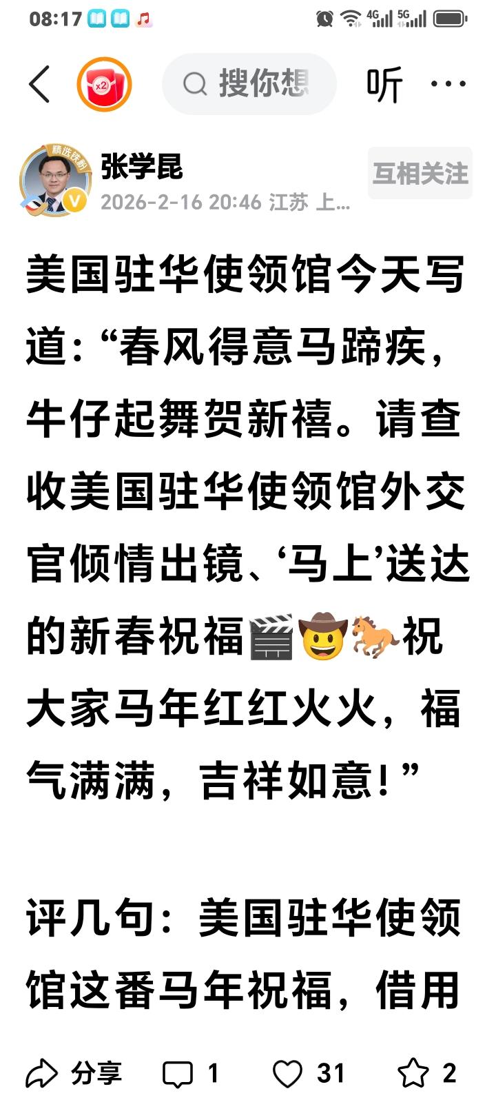 美国驻华使馆今天写到:春风得意马蹄疾,牛仔起舞贺新禧,请查收美国驻华外交官倾情出镜,马上送达新春祝福,祝大家马红红火火,福气满满,专祥如意! 说两句:希望美国真心改恶从善,不再作妖,大家都是地球人,好好相处,一起发展。