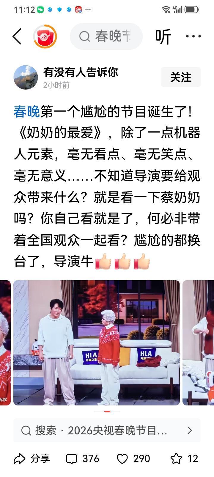 今年春晚很多网友吐槽蔡奶奶的小品《奶奶的最爱》除了一点机器人元素,毫无看点,毫无笑点,毫无意义,但是他们不知道这个小品里藏着很多意义和情怀。蔡明老师从1996春晚小品扮演机器人《机器人趣话》到2026年时隔30年和机器人同台演出,幻想照进了现实,也见证了我们国家的科技发展进步,这标志着我们的国家越来越强大,人民越来越幸福。很多年轻人都不知以前的小品,今年应该把30年前的小品片段加上,感慨我们国家的发展进步,会更完美。