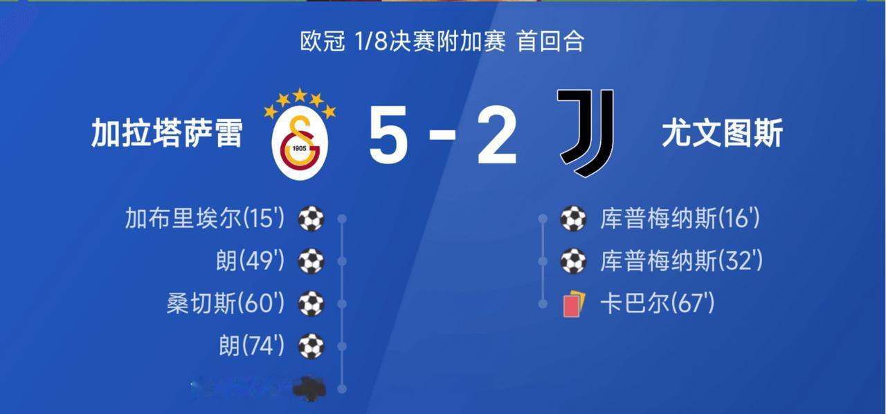 欧冠附加赛2-5不敌加拉塔萨雷,尤文想翻盘难度可不小。 欧冠改制以来尤文在附加赛上的表现都不好,上赛季被埃因霍温淘汰还历历在目,这次2-5输给加拉塔萨雷,上半场2-1领先,下半场连丢4个,回头再看看尤文能用的后卫就布雷默、卡卢卢、凯利、加蒂,不得已让坎比亚索客串左后卫,就这捉襟见肘的后防,布雷默踢了34分钟还伤退了,让平时都不怎么打比赛的卡瓦尔上场顶替坎比亚索,再加上基本射正就有的迪格雷戈里奥,也难怪下半场尤文要崩了。 尤文目前已是四连败,意大利杯出局,联赛排第五,差榜首15分,只能争争欧冠资格,而另一支参加欧冠附加赛的球队亚特兰大也0-2输给了多特,看来意甲的颜面还得交给国米了,但不可否认的是意甲的竞争力确实下滑了。
