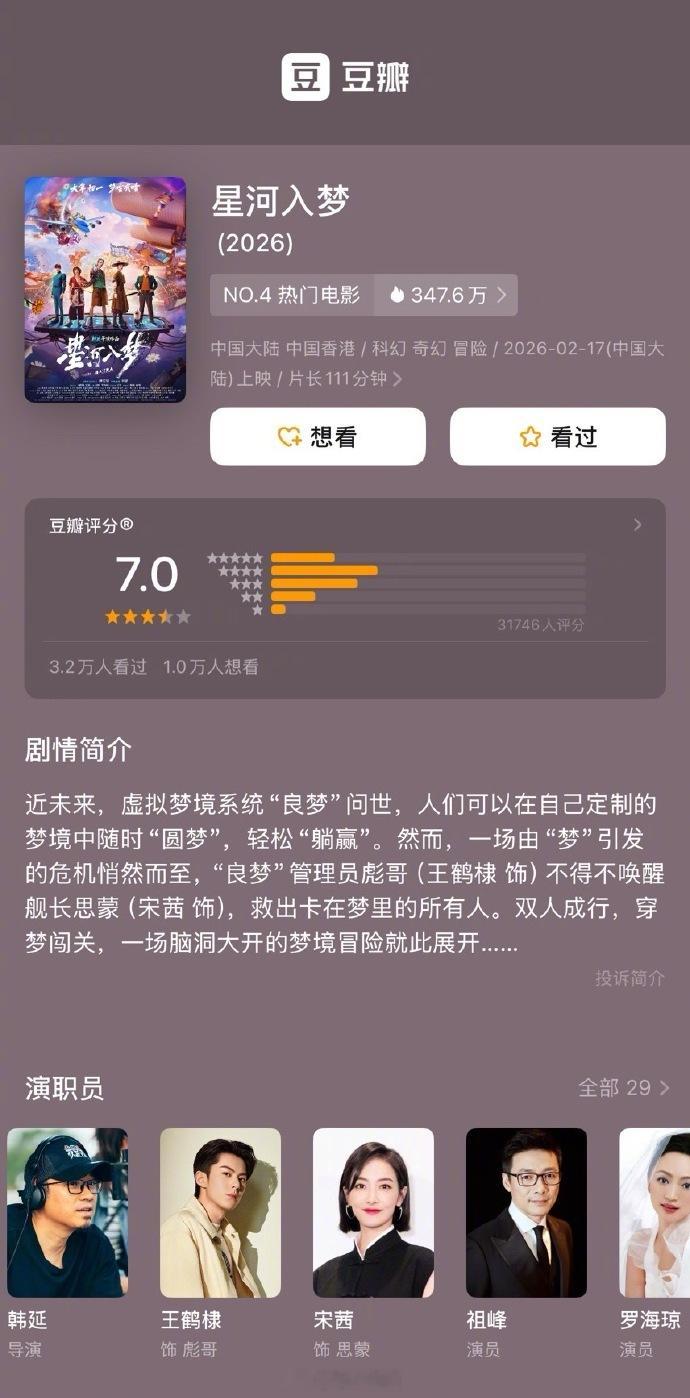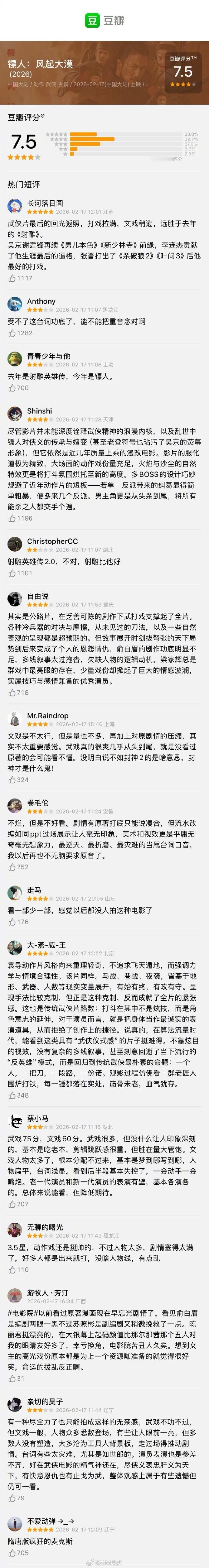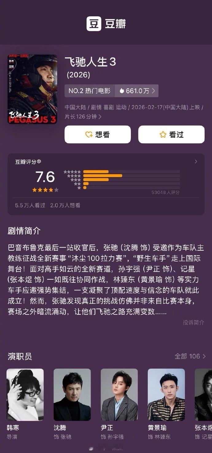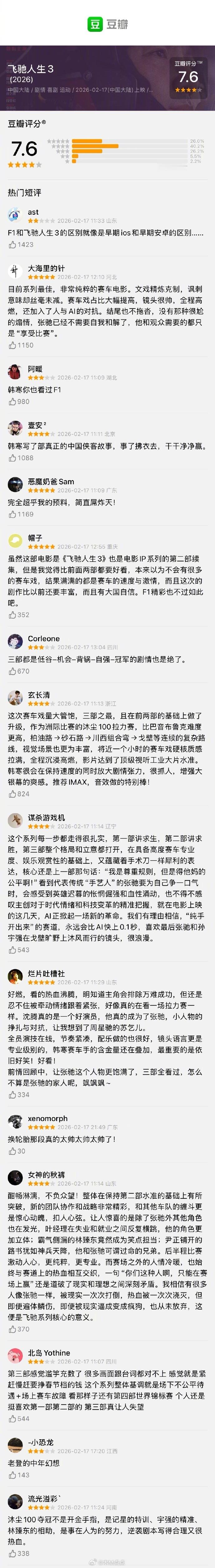 春节档三部电影开分《飞驰人生3》豆瓣开分7.6分《镖人》豆瓣开分7.5分《星河入梦》豆瓣开分7.0分