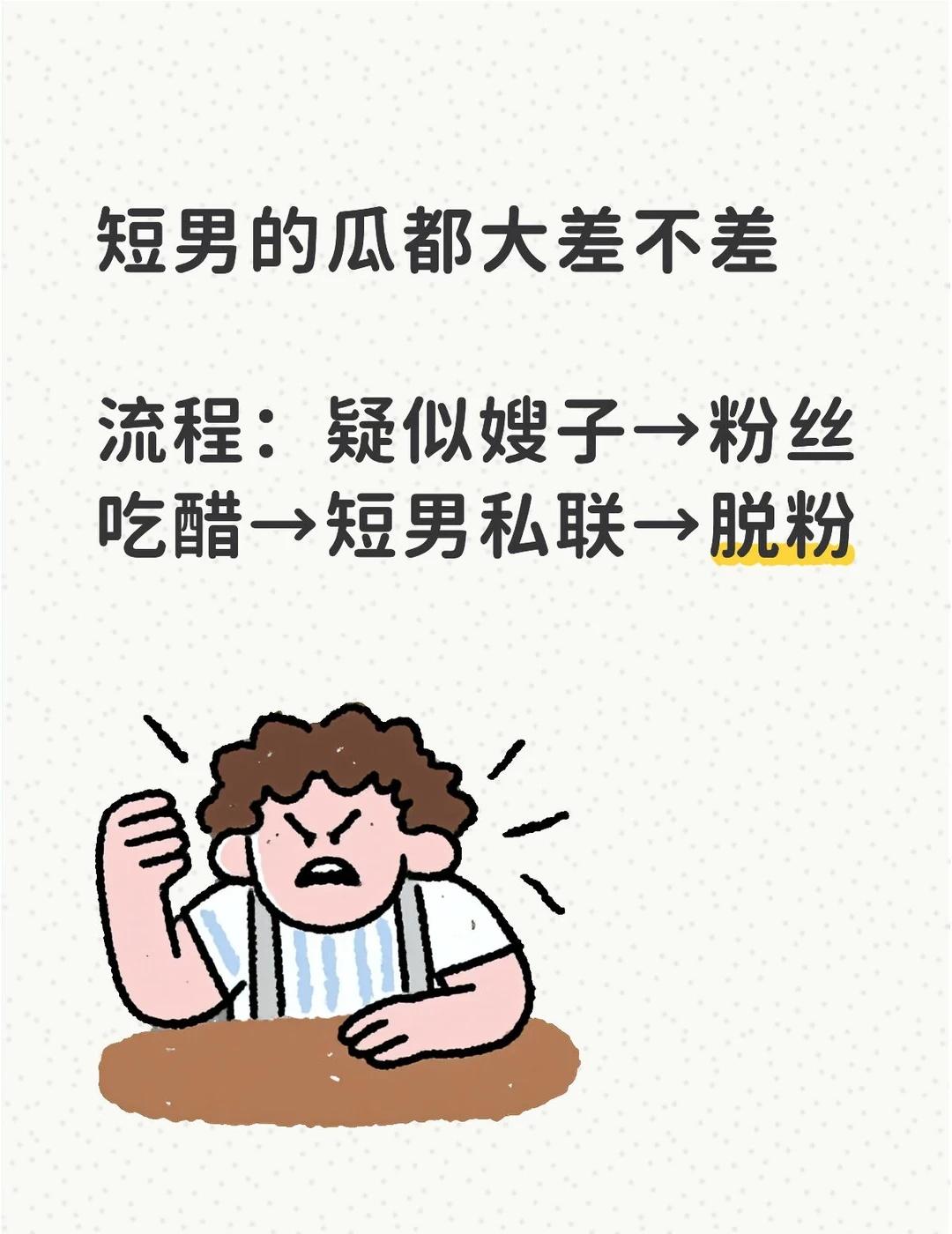 短男的瓜都大差不差 流程:疑似嫂子→粉丝吃醋→短男私联→脱粉 短男的瓜都大差不差 流程:疑似嫂子→粉丝吃醋→短男私联→脱粉 顺序可以互换,这个公式一套一个准 短剧男演员