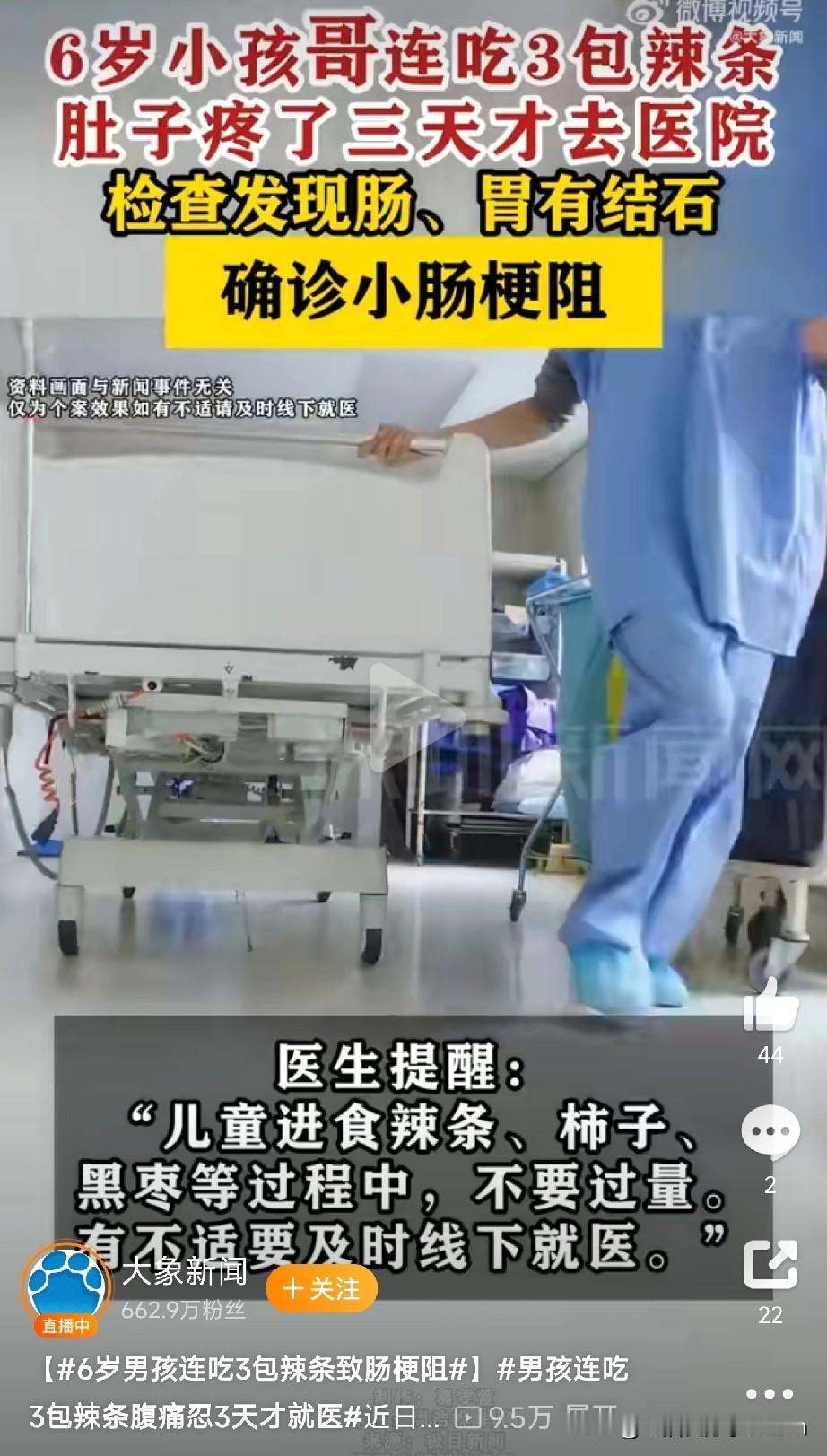 真心疼这个孩子! 湖北一个6岁的小男孩,差点因为几包辣条把命给丢了。 这孩子平时跟着爷爷奶奶生活,老人嘛,总是惯着孙子。小家伙特别爱吃辣条,前几天趁大人不注意,一口气连干了3包! 吃完没多久孩子就喊肚子疼。但大家都以为是吃坏肚子了,揉一揉就好了。 谁能想到,这孩子硬生生疼了3天,实在扛不住了才送到医院一检查,医生都倒吸一口凉气——孩子的肠道里密密麻麻堵满了胃结石和肠结石,导致小肠梗阻!再晚来一点,肠道就要缺血坏死,那可是要切肠子的啊! 为啥吃辣条能吃出石头来? 医生解释说,辣条本身就是高油高盐的重口味食品,里面全是添加剂和香料。孩子的肠胃娇嫩,根本消化不了。加上这娃平时跟着老人吃饭不规律,这些食物残渣就在肚子里慢慢"和成泥、捏成团",最后变成了硬邦邦的"石头"。 幸亏医院做了腹腔镜手术才把石头取出来,孩子总算捡回一条命。 说句实在话,当家长的真得长点心。特别是留守在家的孩子,爷爷奶奶疼是疼,但有些零食的危害他们真的不懂。辣条、柿饼、黑枣这类东西,偶尔解解馋可以,千万别让孩子当饭吃。 孩子喊肚子疼,也别总以为是"装病"或者"着凉"。如果是持续腹痛,尤其是吃了某些东西之后开始的,一定别拖,赶紧去医院看看! (文章素材来自大象新闻,侵删)