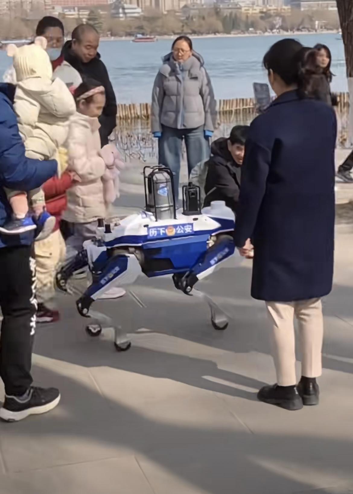 “你们围着我,都不好意思了!”山东济南,大明湖公园里的游客在围观一个稀罕物,它会拜年,会害羞,还会识别危险物品,网友表示:济南让我越来越惊喜了! 大明湖游客围观的,是一款高科技产品,外型像机器狗,但是人家叫机器狼,是不是听起来比狗更厉害?! 这款机器狼,长不足一米,高也就六七十厘米,身材小巧,身上高科技却不少,有雷达,还有热成像系统,四条腿跑起来如履平地,全速前进,一个小时可以跑20多里路,相当于跑个半马。 它的功能主要是安保巡逻,据说可以识别危险的东西,还能即时预警,并且,能远程遥控,实现多机协同联动。 这可厉害了,有了这机器狼,以后巡逻再也不用工作人员拿着大喇叭喊话了,机器不知道累,放块电池能用两个半小时,还不挑路况,爬坡过坎的都行。 这些年,济南的科技含量越来越高了,人工智能创新应用、AI试验、工业互联网发展等方面都可圈可点,济南的算力、区块链技术和空天信息产业,在全国都是数一数二的,济南的城建、文旅、安防、交通等,科技感拉满,科技让这座古城,焕发出勃勃生机!