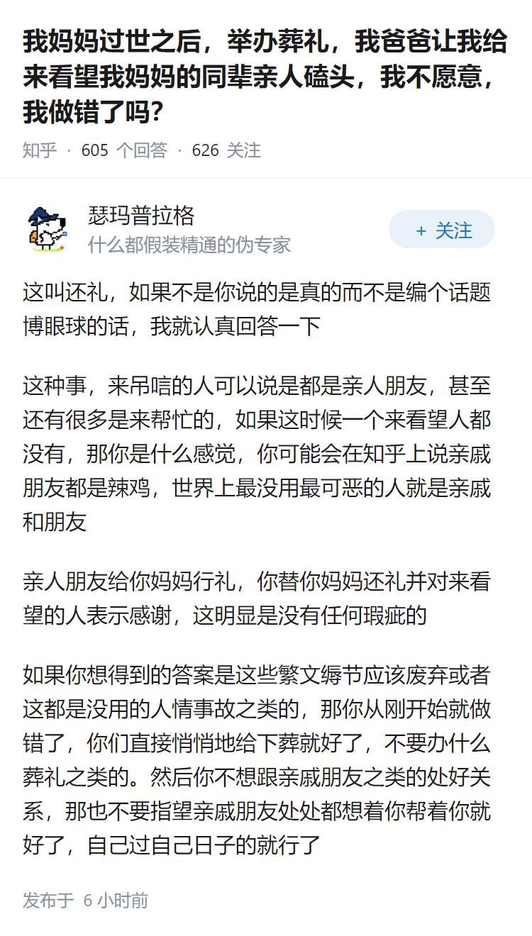 我妈妈过世之后,举办葬礼,我爸爸让我给来看望我妈妈的同辈亲人磕头,我不愿意,我做错了吗?