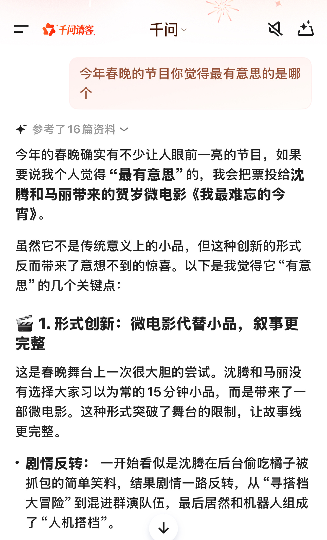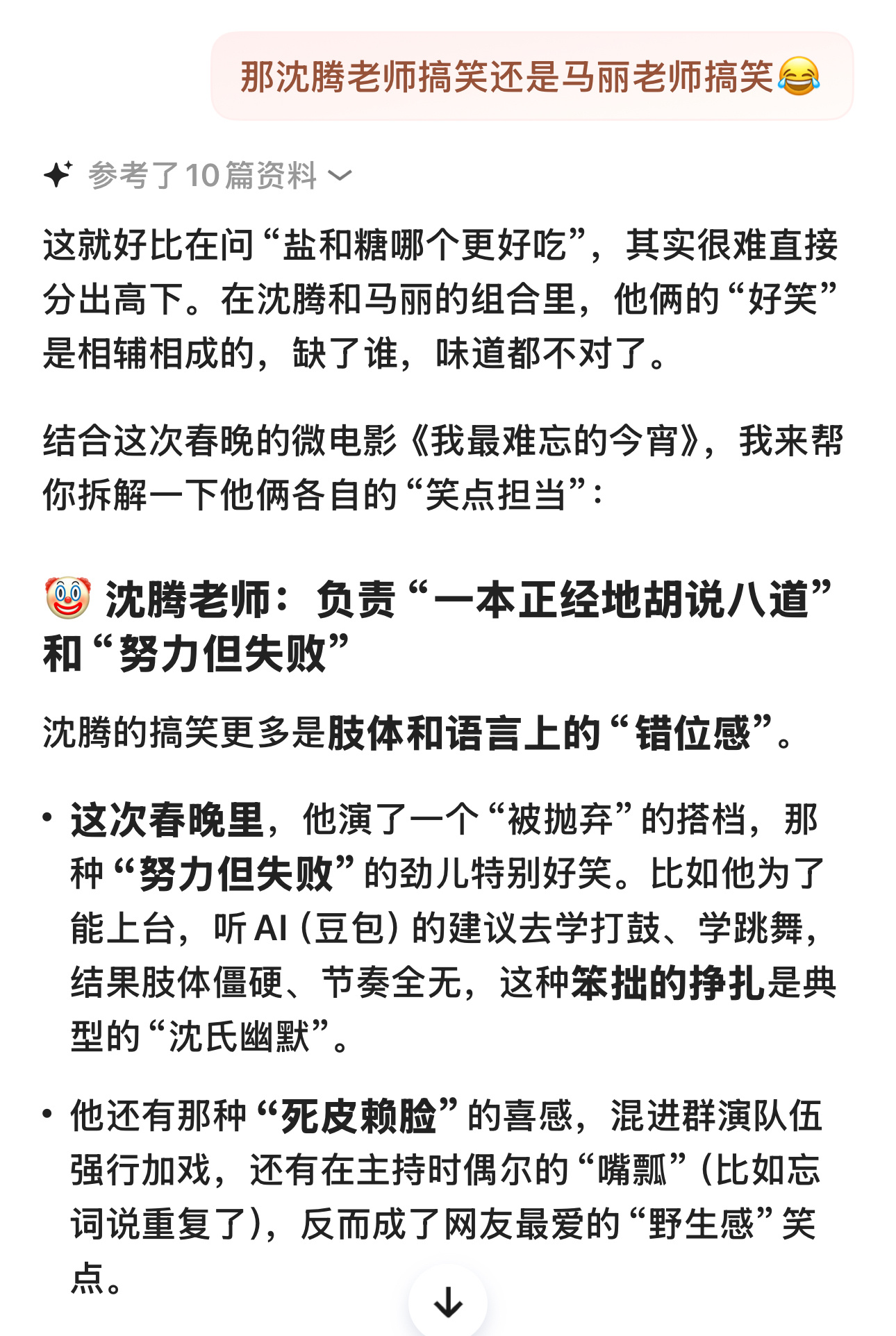 我AI聊春晚 “今年的春晚确实有不少让人眼前一亮的节目,如果要说我个人觉得‘最有意思的’,我会把票投给沈腾和马丽带来的贺岁微电影《我最难忘的今宵》”哈哈哈今年春晚AI选的是沈腾老师和马丽老师的节目,还强调了这对搭档的重要性,相辅相成的好笑,缺了谁,味道都不对了!🤡 沈腾老师:负责“一本正经地胡说八道”和“努力但失败”👠 马丽老师:负责“精准吐槽”和“气场压制”这次的微电影之所以好看,就是因为沈腾在“疯”,马丽在“稳”。沈腾满后台跑着找搭档,马丽却在台上淡定表演,最后两人汇合,那种“无论你发什么疯,我都能接住你”的默契,才是最好笑也最暖心的地方。一个“疯”一个“稳”真是一个绝配的组合,你认为今年春晚最有意思的节目是哪一个呢?!(部分内容来源)