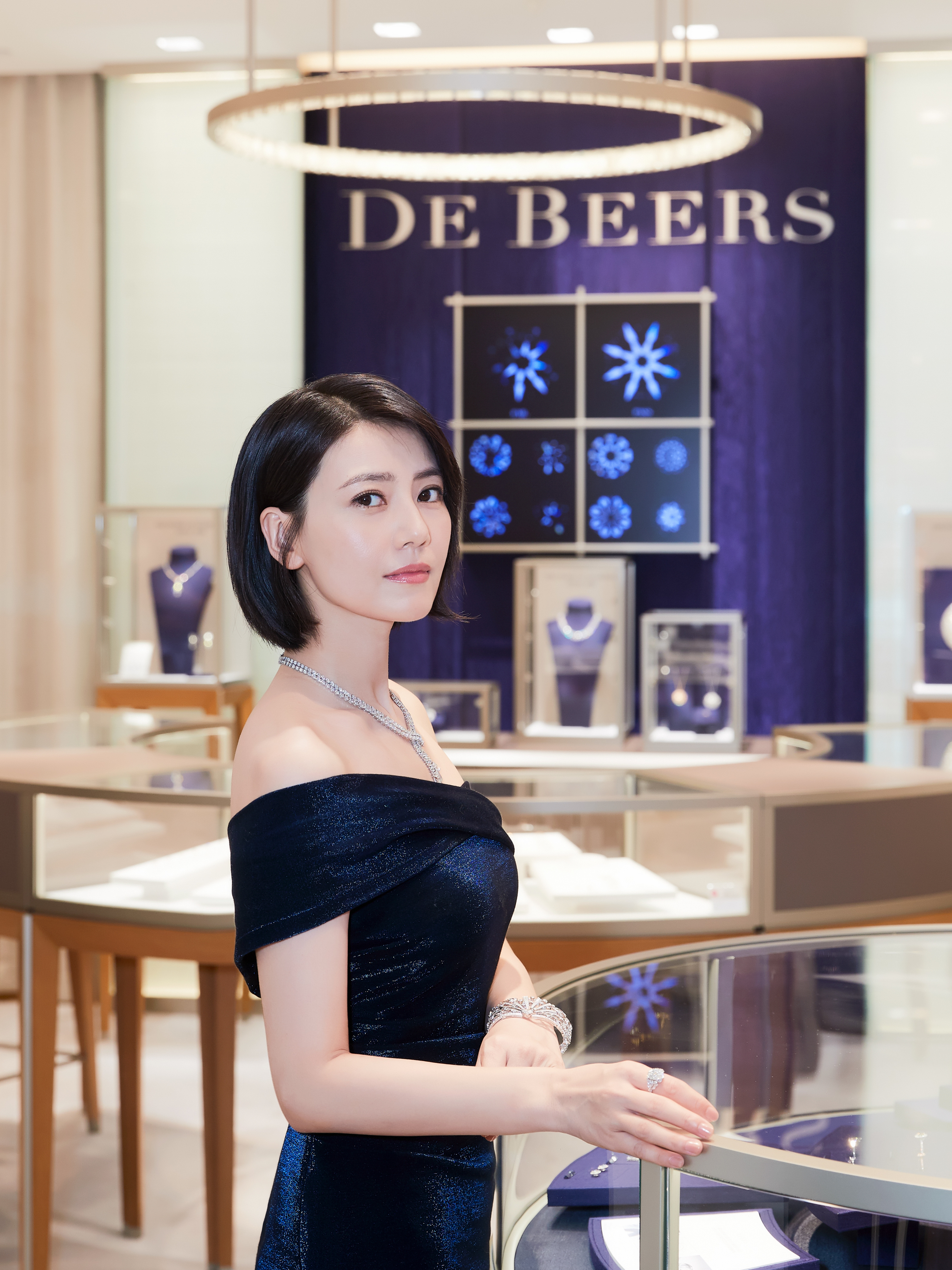 马年发大财!钱包鼓鼓,工作顺溜,全家都跟着沾福气!身着藏青色露肩礼服,搭配璀璨的钻石项链与手镯,在戴比尔斯珠宝店中尽显优雅大气。她的短发利落干练,与珠宝的闪耀相得益彰,既展现出东方女性的温婉,又不失现代都市女性的自信气场。无论是侧身凝视还是低头浅笑,都将珠宝的精致与自身的气质完美融合,尽显高级质感与从容魅力。高圆圆