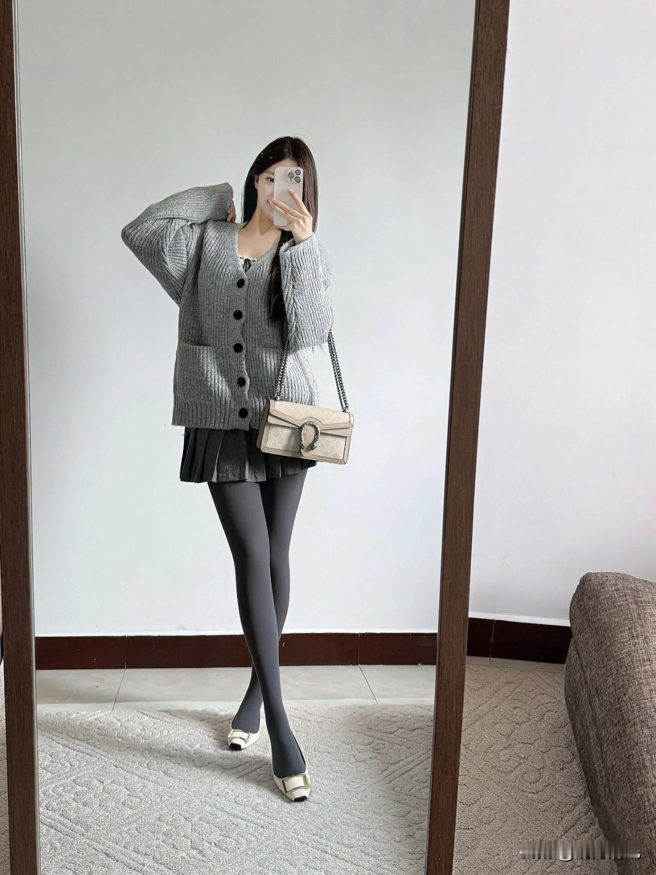 灰色连裤袜真是越穿越喜欢!刚开始穿还觉得普通,多穿几次就发现它的好了。 柔软的质感贴着皮肤,不紧不勒,很舒服。搭配灰色针织开衫和深灰百褶短裙,一身灰调意外地好看——从浅灰到深灰的过渡,像渐变的天空,自然又和谐。不用花太多心思,简简单单就挺有味道。 这种穿搭的好处是,穿上整个人都安静下来了。在忙乱的日子里,不用纠结颜色搭不搭,也不用担心出错。灰色低调但不单调,藏着一点点温柔,一点点随性。 有时候想,选什么衣服大概也反映着想要什么样的状态吧。我就喜欢这种简单里有细节、不张扬却耐看的感觉。 新年爱好打卡连裤袜 灰色连裤袜