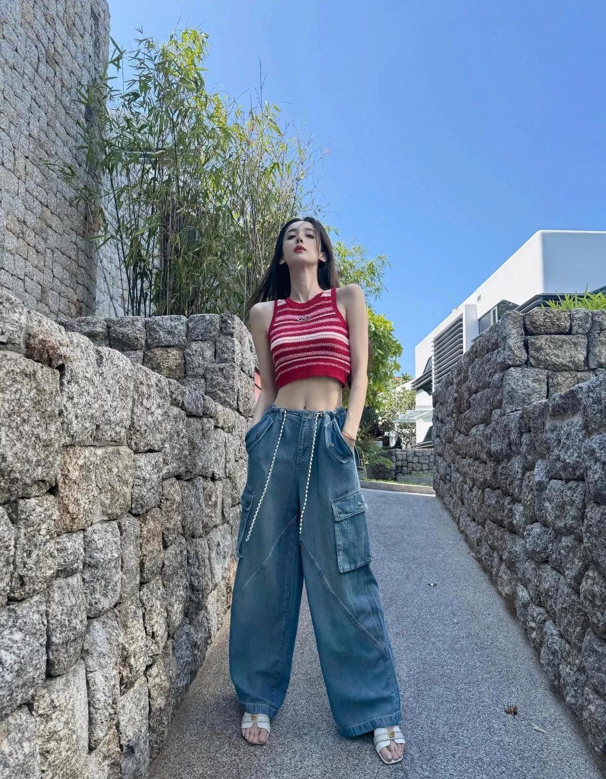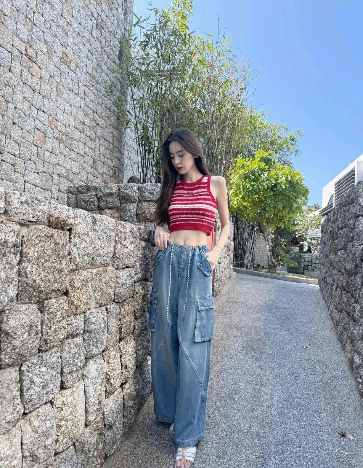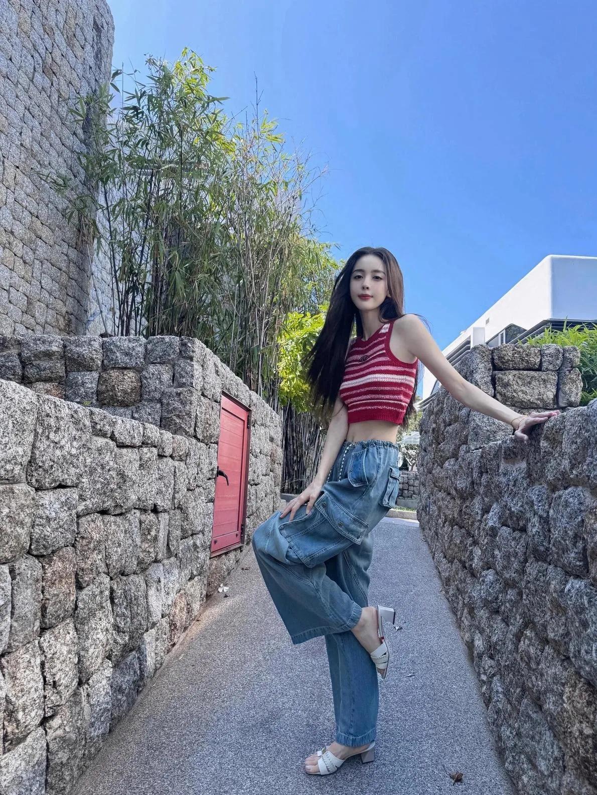 被古力娜扎的这套私服狠狠种草了!👖 红白条纹针织背心,复古又显白,短款设计还能优化身材比例。 搭配一条高腰工装牛仔裤,瞬间拉长腿部线条,对小个子也很友好。 春天想走甜酷路线的姐妹,这套可以直接抄作业! 古力娜扎同款 春季穿搭 甜酷风 短款上衣
